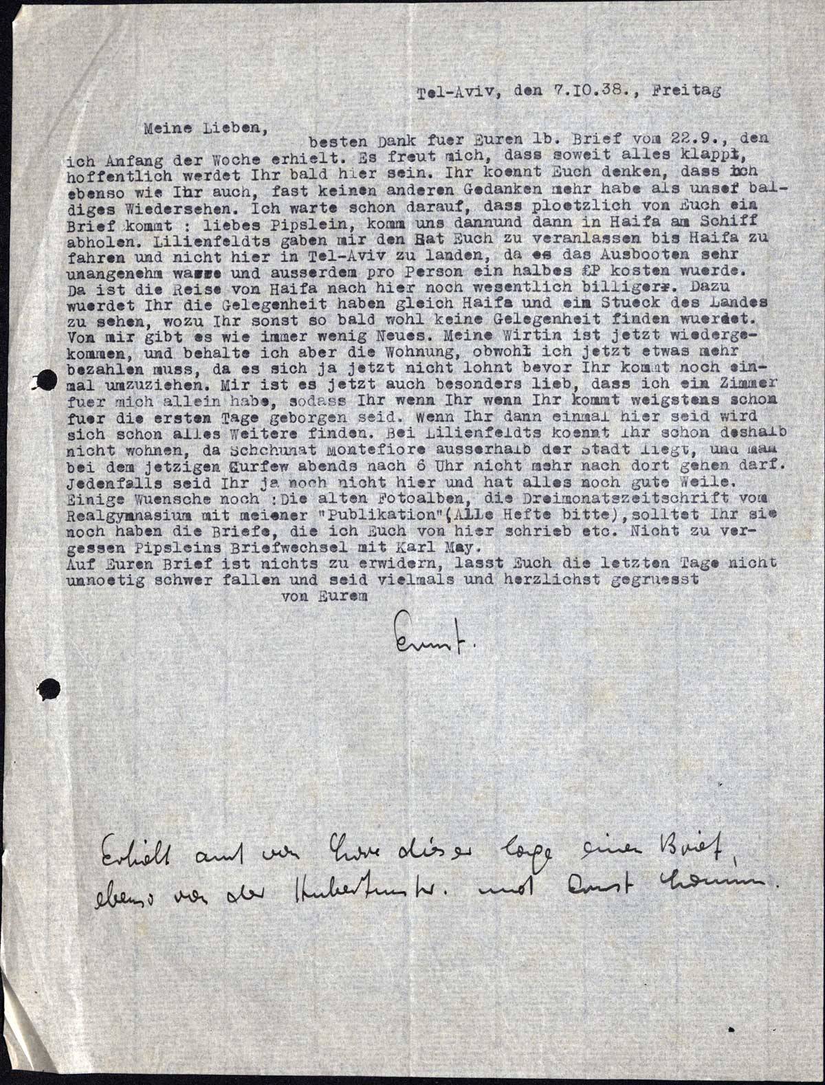 besten Dank fuer Euren lb. Brief vom 22. 9., den ich Anfang der Woche erhielt. Es freut mich, dass soweit alles klappt, hoffentlich werdet Ihr bald hier sein. Ihr koennt Euch denken, dass ich ebenso wie Ihr auch, fast keinen anderen Gedanken mehr habe als unser baldiges Wiedersehen. Ich warte schon darauf, dass ploetzlich von Euch ein Brief kommt: liebes Pipslein, komm uns dann und dann in Haifa am Schiff abholen. Lilienfeldts gaben mir den Rat Euch zu veranlassen bis Haifa zu fahren und nicht hier in Tel-Aviv zu landen, da das Ausbooten sehr unangenehm waere und ausserdem pro Person ein halben ₤P kosten wuerde. Da ist die Reise von Haifa nach hier noch wesentlich billiger. Dazu wuerdet Ihr die Gelegenheit haben gleich Haifa und ein Stueck des Landes zu sehen, wozu Ihr sonst so bald wohl keine Gelegenheit finden wuerdet. Von mir gibt es wie immer wenig Neues. Meine Wirtin ist jetzt wiedergekommen, und behalte ich aber die Wohnung, obwohl ich jetzt etwas mehr bezahlen muss, da es sich ja jetzt nicht lohnt bevor Ihr kommt noch einmal umzuziehen. Mir ist es jetzt auch besonders lieb, dass ich ein Zimmer fuer mich allein habe, so dass Ihr wenn Ihr kommt wenigstens schon fuer die ersten Tage geborgen seid. Wenn Ihr dann einmal hier seid, wird sich schon alles Weitere finden. Bei Lilienfeldts koennt Ihr schon deshalb nicht wohnen, da Schchunat Montefiore ausserhalb der Stadt liegt, und man bei dem jetzigen Curfew abends nach 6 Uhr nicht mehr nach dort gehen darf. Jedenfalls seid Ihr ja noch nicht hier und hat alles noch gute Weile.
