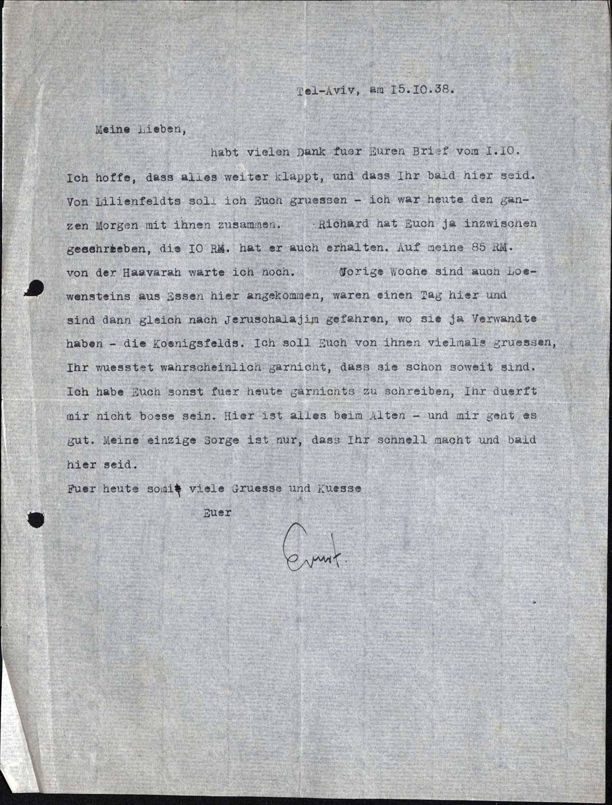 Vorige Woche sind auch Loewensteins aus Essen hier angekommen, waren einen Tag hier und sind dann gleich nach Jeruschalajim gefahren, wo sie ja Verwandte haben - die Koenigsfelds. Ich soll Euch von ihnen vielmals gruessen, Ihr wuesstet wahrscheinlich garnicht, dass sie schon soweit sind. Ich habe Euch sonst fuer heute garnichts zu schreiben, Ihr duerft mir nicht boese sein. Hier ist alles beim Alten - und mir geht es gut. Meine einzige Sorge ist nur, dass Ihr schnell macht und bald hier seid.