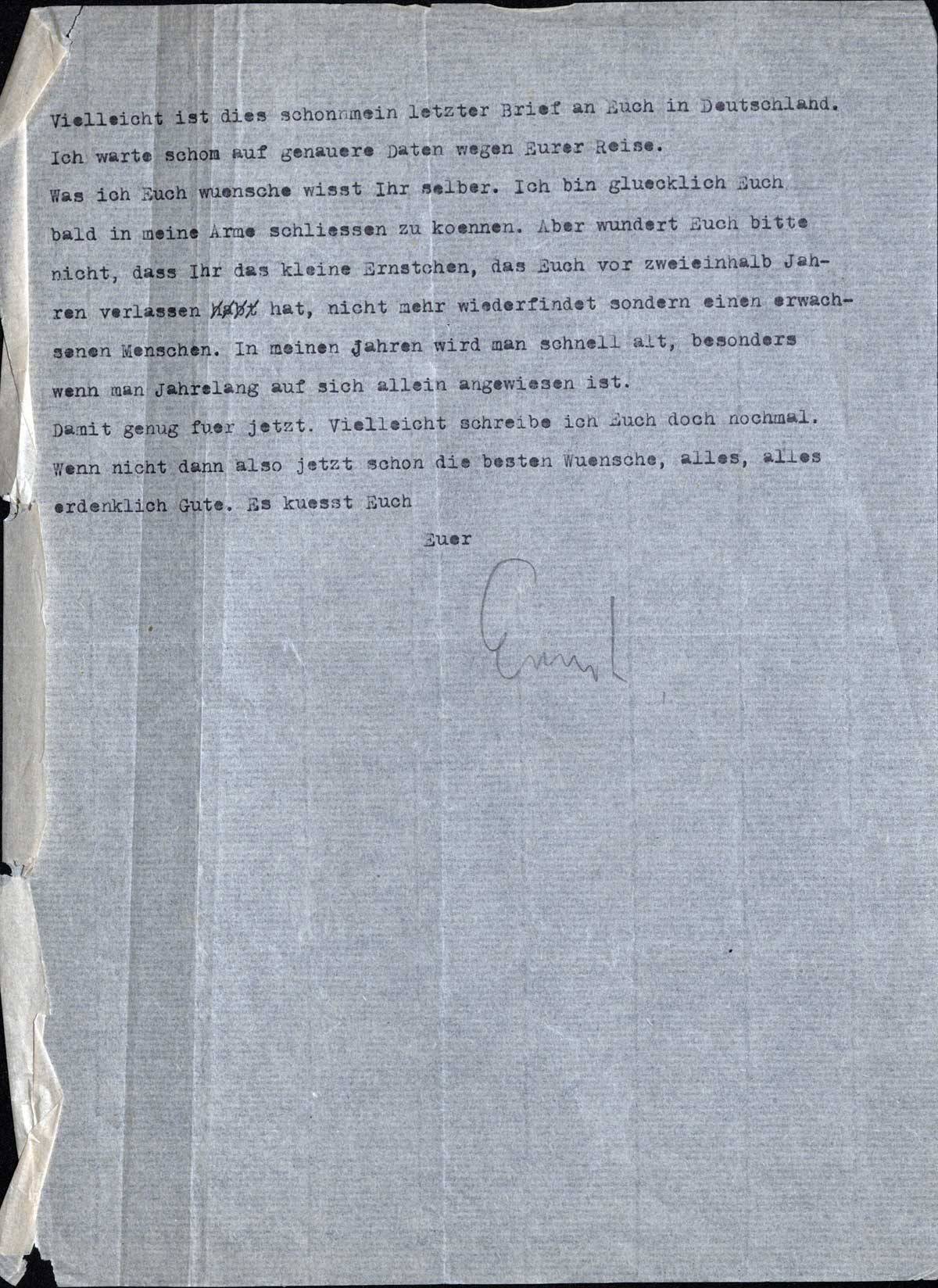 Was ich Euch wuensche wisst Ihr selber. Ich bin gluecklich Euch bald in meine Arme schliessen zu koennen. Aber wundert Euch bitte nicht, dass Ihr das kleine Ernstchen, das Euch vor zweieinhalb Jahren verlassen hat, nicht mehr wiederfindet sondern einen erwachsenen Menschen. In meinen Jahren wird man schnell alt, besonders wenn man jahrelang auf sich allein angewiesen ist.
