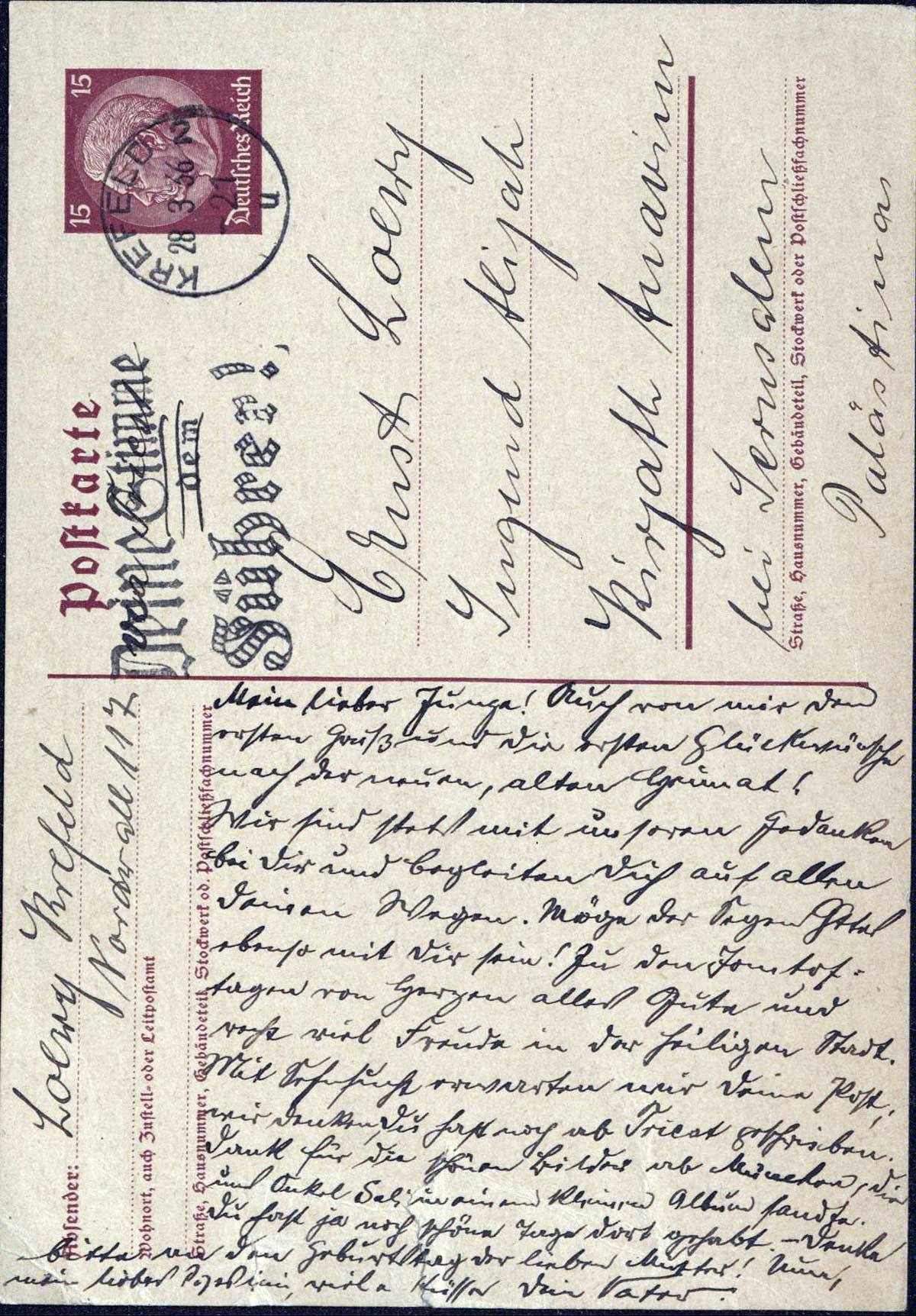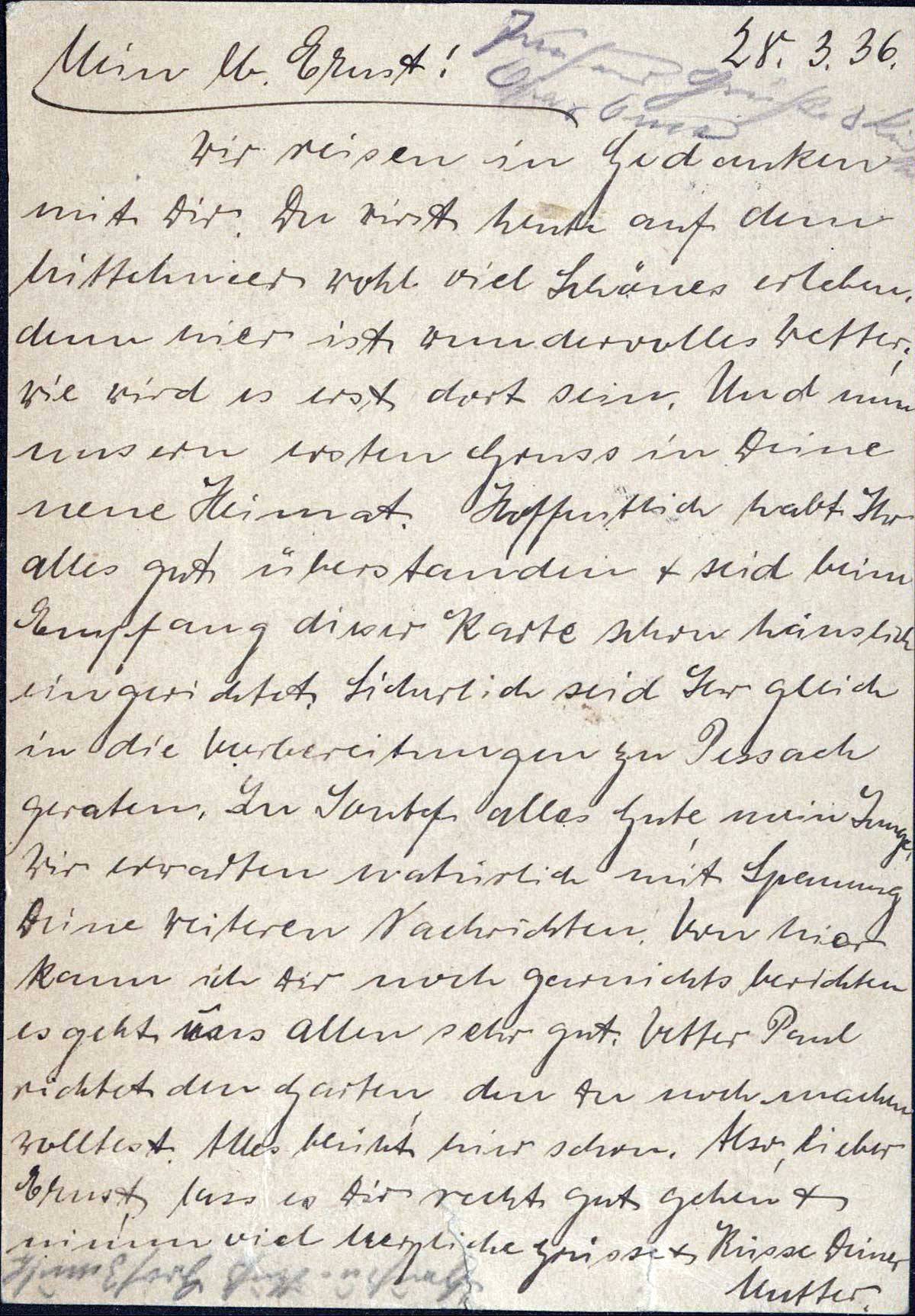 Wir reisen in Gedanken mit Dir. Du wirst heute auf dem Mittelmeer wohl viel Schönes erleben, denn hier ist wundervolles Wetter; wie wird es erst dort sein. Und nun unsern ersten Gruss in Deine neue Heimat. Hoffentlich habt Ihr alles gut überstanden & seid beim Empfang dieser Karte schon häuslich eingerichtet. Sicherlich seid Ihr gleich in die Vorbereitungen zu Pessach geraten. Zu Jontef alles Gute, mein Junge, wir erwarten natürlich mit Spannung Deine weiteren Nachrichten. Von hier kann ich Dir noch garnichts berichten, es geht uns allen sehr gut. Vetter Paul richtet den Garten, den Du noch machen wolltest. Alles blüht hier schon. Also, lieber Ernst, lass es Dir recht gut gehen & nimm viel herzliche Grüsse & Küsse