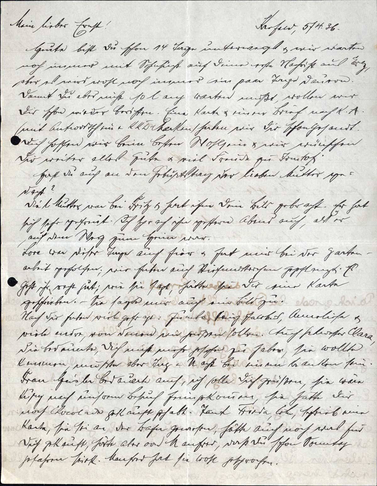 Mein lieber Junge! Mein Brief, den ich gestern begann, ist liegen geblieben, da die l. Mutter & auch Levys noch anschreiben sollten. Unterdessen war, wie Du siehst, Lore hier & hat mir ihr Bild gebracht; sie war eine Stunde hier. Noch hat sie Dich nicht vergessen! -