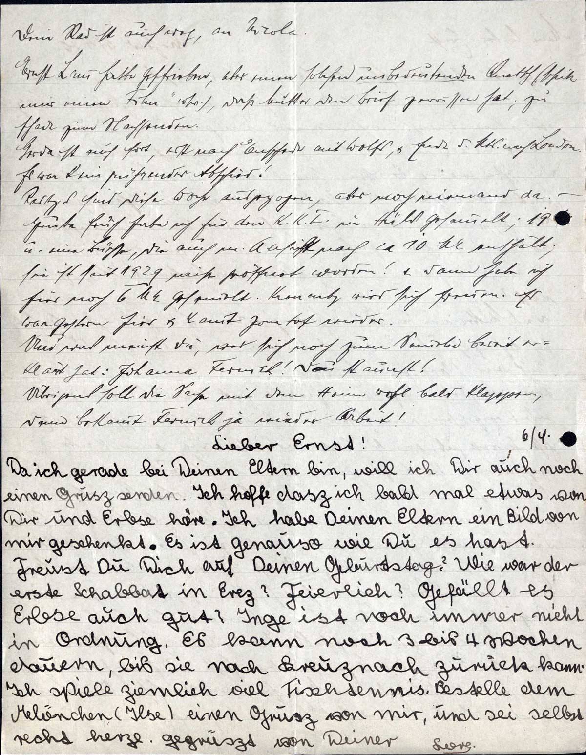 Als 4te im Bunde komme ich an die Reihe. Alle Neuigkeiten hat Vater Dir schon geschrieben, ich bin also heute dumm. Hoffentlich kommt bald Nachricht von Dir & bei Euch alles in bester Ordnung. Gleich gehe ich mit Vater zur Synagoge. Habt Ihr gut Jontef gehalten? Alles Gute & Schöne & viel Grüsse & Küsse