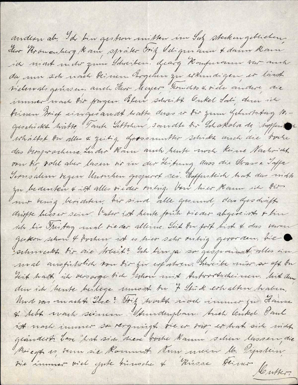 andern ab. Ich bin gestern mitten im Satz steckengeblieben, Herr Kronenberg kam, später Fritz Seligmann & dann kam ich nicht mehr zum Schreiben. Georg Kaufmann war auch da, um sich nach Deinem Ergehen zu erkundigen, er lässt vielmals grüssen; auch Herr Meyer, Fernichts & viele andere, die immer nach Dir fragen. Eben schreibt Onkel Sali, dem ich Deinen Brief eingesandt hatte, dass er Dir zum Geburtstag 10.- geschickt hätte, Tante Jettchen sandte Dir Schokolade, hoffentlich erhältst Du alles & zeitig. Grossmutter schickt auch die Woche das Versprochene. Leider kam auch heute noch keine Nachricht von Dir, wohl aber lasen wir in der Zeitung, dass die Strasse Jaffa-Jerusalem wegen Unruhen gesperrt sei. Hoffentlich hat das nichts zu bedeuten & ist alles wieder ruhig. Von hier kann ich Dir nur wenig berichten. Wir sind alle gesund, das Geschäft dürfte besser sein. Vater ist heute früh wieder abgereist & bin ich bis Freitag mal wieder alleine. Seit Du fort bist & das waren gestern schon 4 Wochen, ist es hier sehr ruhig geworden. Wie schmeckt Dir die Arbeit? Ich bin ja so gespannt, alles einmal ausführlich von Dir zu erfahren. Schreibe mir so oft Du Zeit hast, ich versorge Dich schon mit Antwortscheinen. Mit dem, den ich heute beilege musst Du 7 Stück erhalten haben. Und was macht Ilse? Fritz hockt noch immer zu Hause & lebt nach seinem Stundenplan. Auch Onkel Paul ist noch immer so vergnügt wie er war, er hat sich nicht geändert. Lore hat sich diese Woche kaum sehen lassen, die kriegt es, wenn sie kommt. Nun, mein lb. Pipslein, wie immer viel gute Wünsche & Küsse Deiner