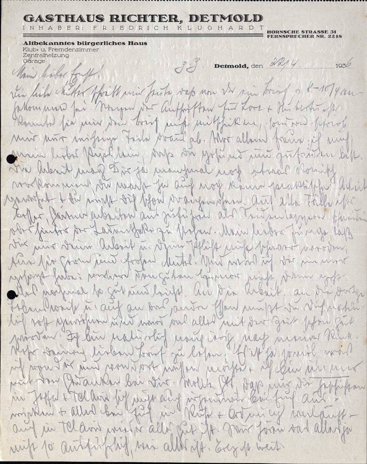 Die liebe Mutter schreibt mir heute, daß von Dir ein Brief v. 8.-10/4. angekommen sei. Wegen der Anschriften für Lore & Hubertusstr. konnte sie mir den Brief nicht mitschicken, sondern schrieb mir nur wichtige Teile draus ab. Vor allem freue ich mich, mein liebes Pipslein, daß Du gesund und zufrieden bist. Die Arbeit mag Dir ja manchmal noch etwas komisch vorkommen, Du warst ja auch noch kaum praktische Arbeit gewohnt & Du wirst Dich schon drangewöhnen. Auf alle Fälle ists besser, Gärtnerarbeiten auszuführen als Seidenlappen schneiden oder hinter der Ladentheke zu stehen. Mein lieber Junge, laß Dir nur Deine Arbeit u. Deine Pflicht nicht schwer werden, tue sie gerne und frohen Mutes. Und was ich Dir immer gesagt habe: verliere den guten Humor nicht, dann geht alles nochmal so gut und leicht. An die Arbeit, an die dortige Lebensweise u. auch an das andre Essen mußt Du Dich natürlich erst gewöhnen und wird das alles mit der Zeit schon gut werden. Ich bin natürlich neugierig nach meiner Rückkehr Deinen lieben Brief zu lesen. Es ist ja soviel, was ich von Dir und von dort wissen möchte & ich bin immer mit den Gedanken bei Dir. Wollte Gott, daß nur die Geschichten in Jaffa & Tel Aviv sich nicht auch irgendwie bei Euch auswirken & alles bei Euch in Ruhe & Ordnung verläuft & auch in Tel Aviv wieder alles gut ist. Wir hören das alles ja nicht so ausführlich, wie alles ist. Erez ist weit.