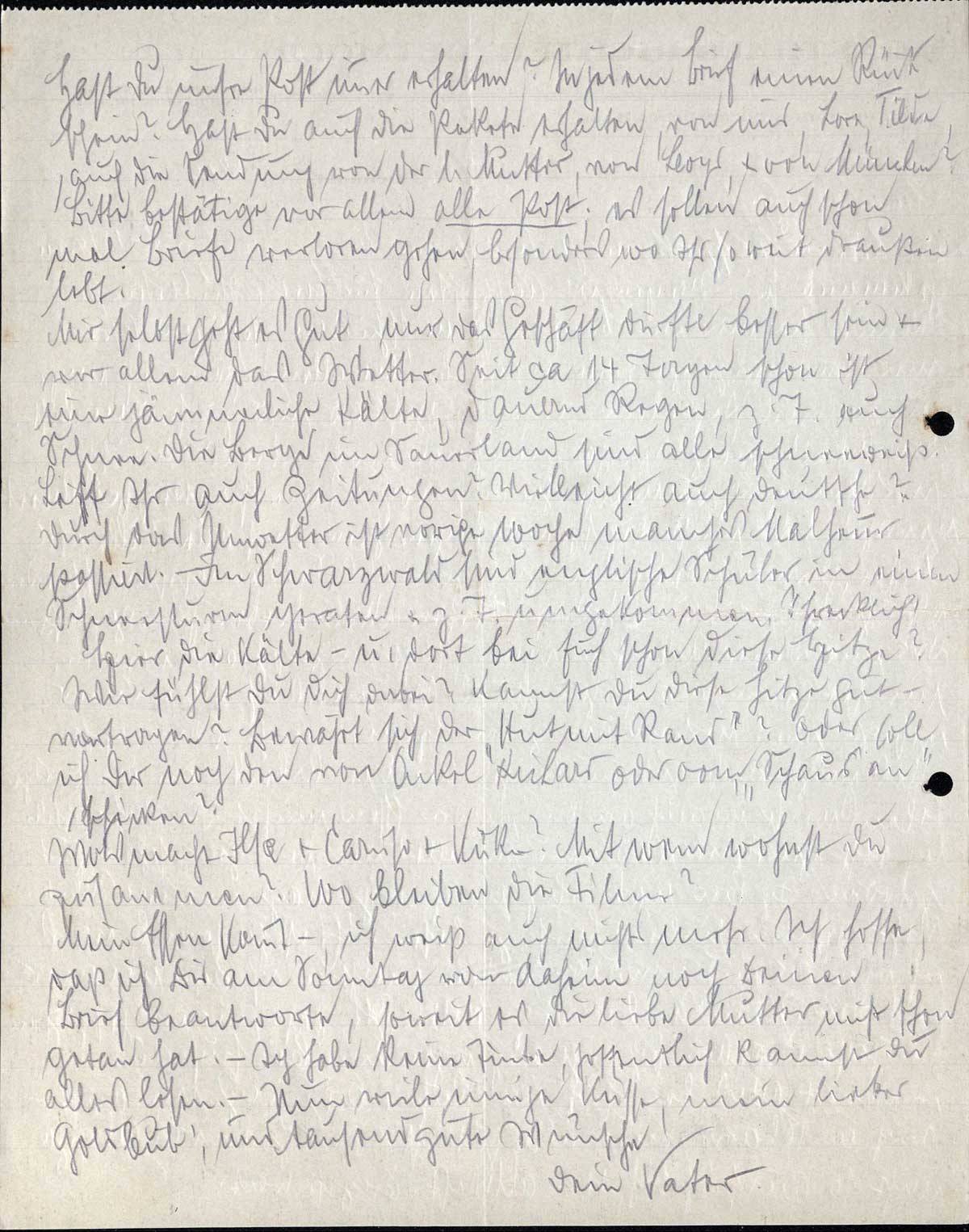 Mir selbst geht es gut, nur das Geschäft dürfte besser sein & vor allem das Wetter. Seit ca 14 Tagen schon ist eine jämmerliche Kälte, dauernd Regen, z. T. auch Schnee. Die Berge im Sauerland sind alle schneeweiß. Lest Ihr auch Zeitungen? Vielleicht auch Deutsche? Durch das Unwetter ist vorige Woche manches Malheur passiert. - Im Schwarzwald sind englische Schüler in einen Schneesturm geraten & z. T. umgekommen. Schrecklich! Hier die Kälte - u. dort bei Euch schon diese Hitze? Wie fühlst Du Dich dabei? Kannst Du diese Hitze gut vertragen? Bewährt sich der „Hut mit Rand”? Oder soll ich Dir noch den von Onkel Richard oder von „Schaus an” schicken?