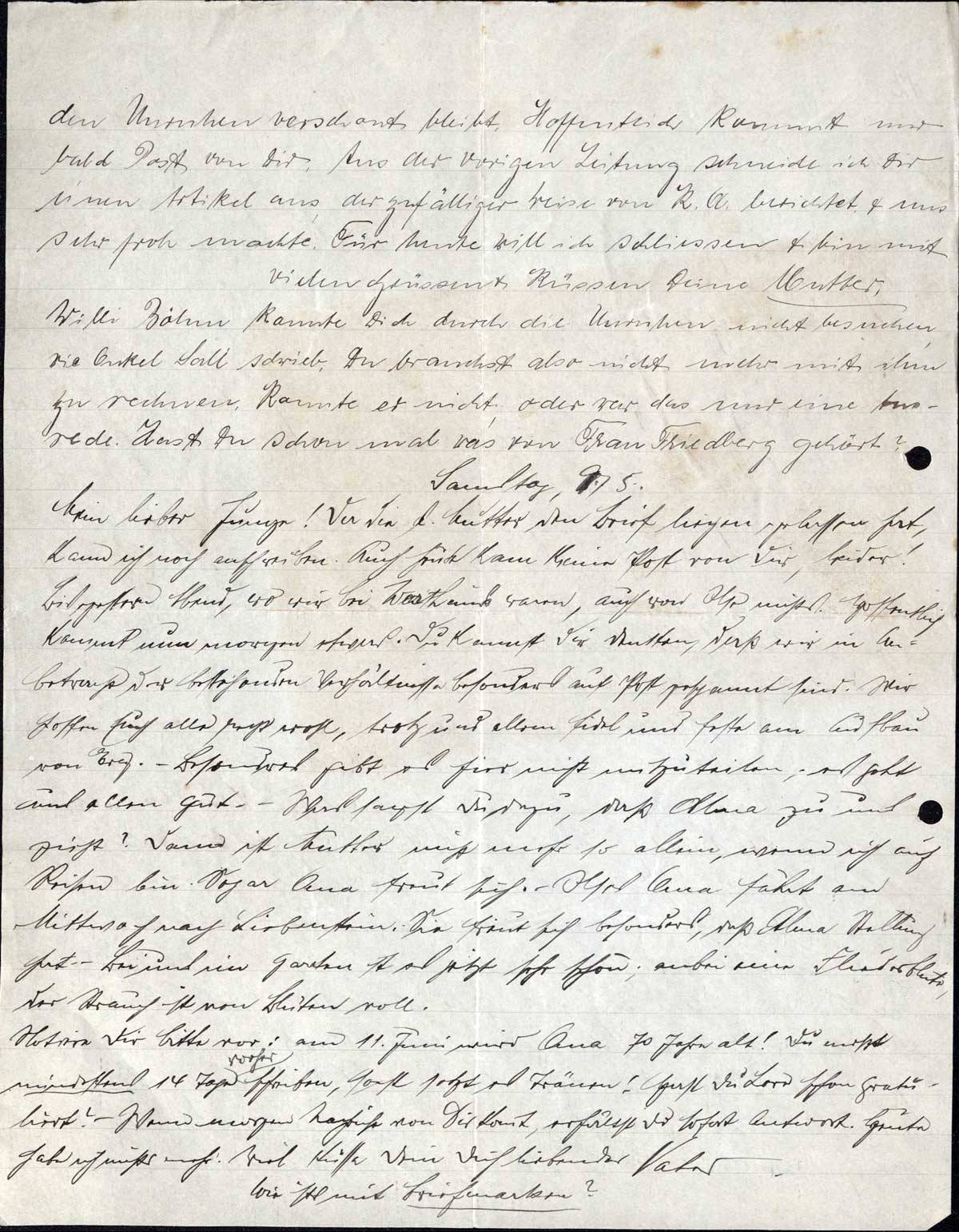Willi Böhm konnte Dich durch die Unruhen nicht besuchen, wie Onkel Sali schrieb. Du brauchst also nicht mehr mit ihm zu rechnen. Konnte er nicht, oder war das nur eine Ausrede. Hast Du schon mal was von Frau Friedberg gehört?