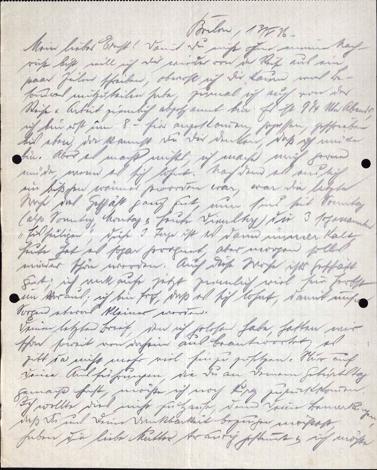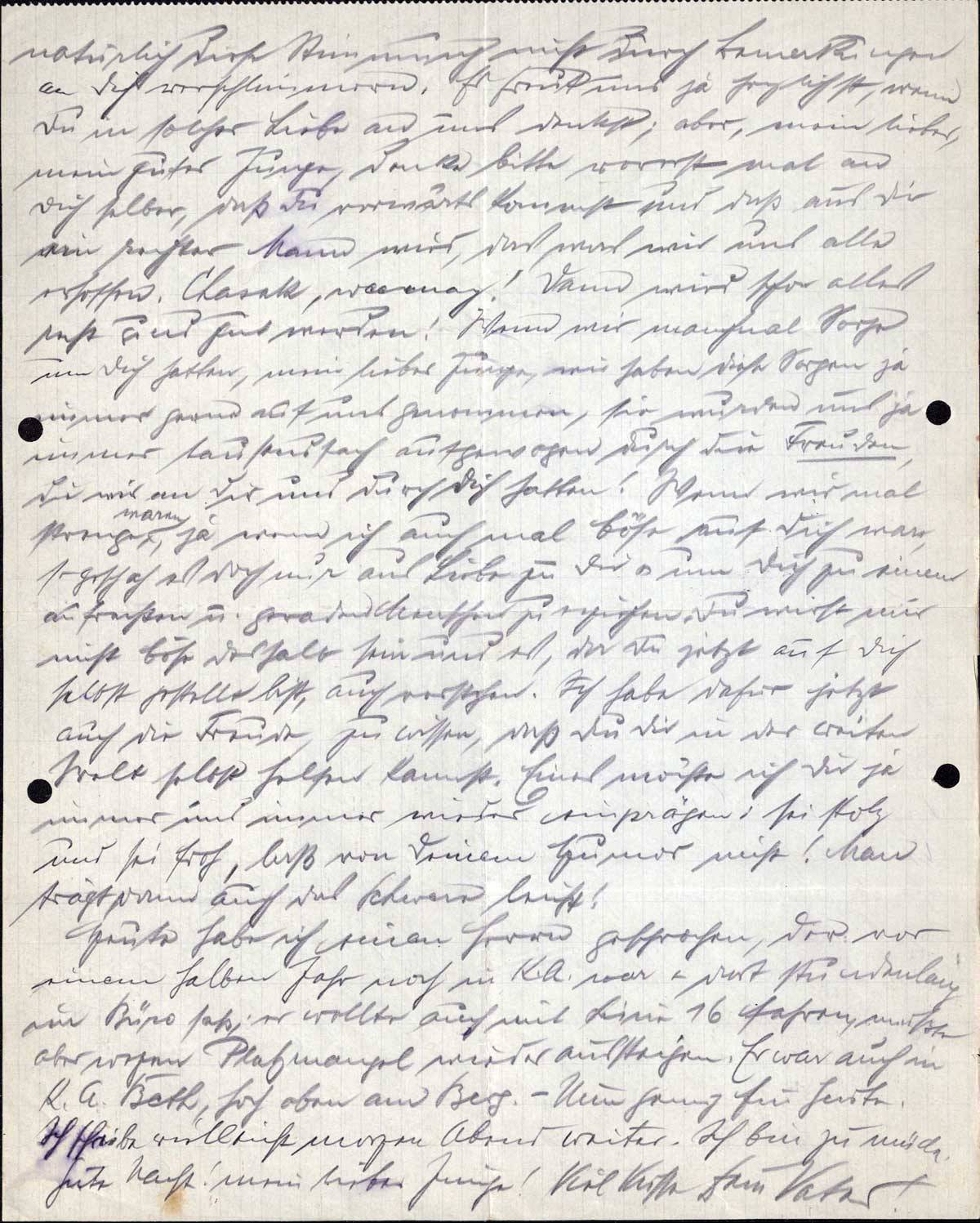 Deinen letzten Brief, den ich gelesen habe, hatten wir schon soweit von daheim aus beantwortet; es gibt da nicht mehr viel hinzuzusetzen. Nur auf Deine Ausführungen, die Du an Deinem Geburtstag gemacht hast, möchte ich noch kurz zurückkommen. Ich wollte dies nicht zu Hause, denn Deine Bemerkungen, daß Du uns Deine Dankbarkeit bezeugen möchtest, haben die liebe Mutter traurig gestimmt & ich möchte