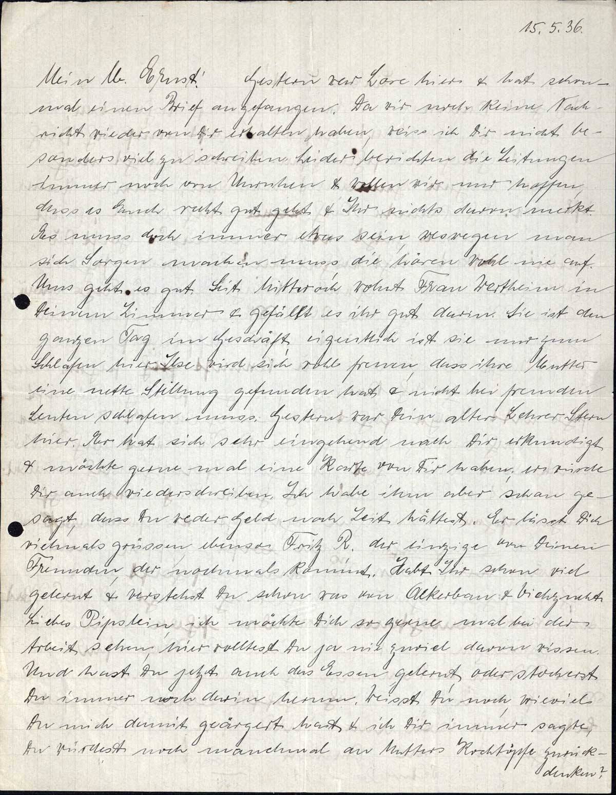 Mein lb. Ernst! Gestern war Lore hier & hat schonmal einen Brief angefangen. Da wir noch keine Nachricht wieder von Dir erhalten haben, weiss ich Dir nicht besonders viel zu schreiben. Leider berichten die Zeitungen immer noch von Unruhen & wollen wir nur hoffen, dass es Euch recht gut geht & Ihr nichts davon merkt. Es muss doch immer etwas sein, weswegen man sich Sorgen machen muss, die hören wohl nie auf. Uns geht es gut. Seit Mittwoch wohnt Frau Wertheim in Deinem Zimmer & gefällt es ihr gut darin. Sie ist den ganzen Tag im Geschäft, eigentlich ist sie nur zum Schlafen hier. Ilse wird sich wohl freuen, dass ihre Mutter eine nette Stillung gefunden hat & nicht bei fremden Leuten wohnen muss. Gestern war Dein alter Lehrer Stern hier. Er hat sich sehr eingehend nach Dir erkundigt & möchte gerne mal eine Karte von Dir haben; er würde Dir auch wiederschreiben. Ich habe ihm aber schon gesagt, dass Du weder Geld noch Zeit hättest. Er lässt Dich vielmals grüssen, ebenso Fritz R., der einzige von Deinen Freunden, der nochmals kommt. Habt Ihr schon viel gelernt & verstehst Du schon was von Ackerbau & Viehzucht. Liebes Pipslein, ich möchte Dich so gerne mal bei der Arbeit sehen, hier wolltest Du ja nie zuviel davon wissen. Und hast Du jetzt auch das Essen gelernt, oder stocherst Du immer noch darin herum. Weisst Du noch, wieviel Du mich damit geärgert hast & ich Dir immer sagte, Du würdest noch manchmal an Mutters Kochtöpfe zurückdenken?