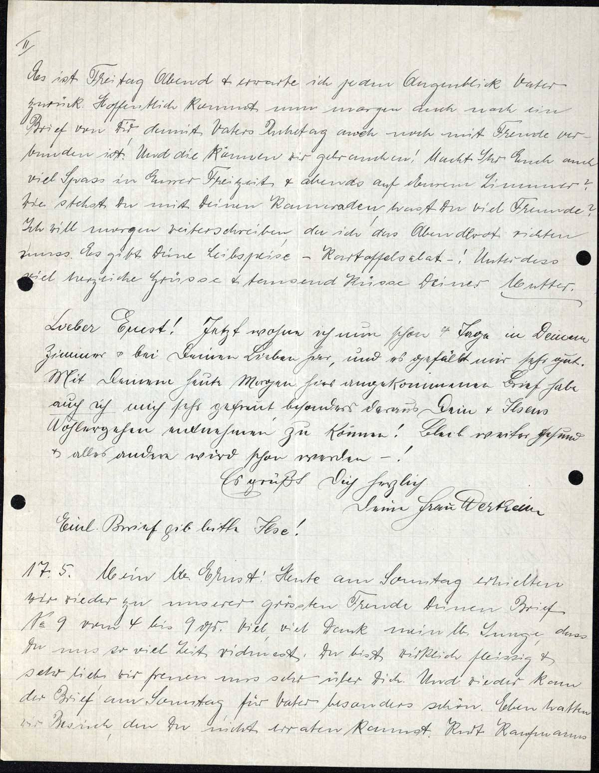 17.5. Mein lb. Ernst! Heute am Sonntag erhielten wir wieder zu unserer grössten Freude Deinen Brief No 9 vom 4 bis 9 ds. Viel, viel Dank mein lb. Junge, dass Du uns so viel Zeit widmest. Du bist wirklich fleissig & sehr lieb; wir freuen uns sehr über Dich. Und wieder kam der Brief am Sonntag, für Vater besonders schön. Eben hatten wir Besuch, den Du nicht erraten kannst. Kurt Kaufmanns