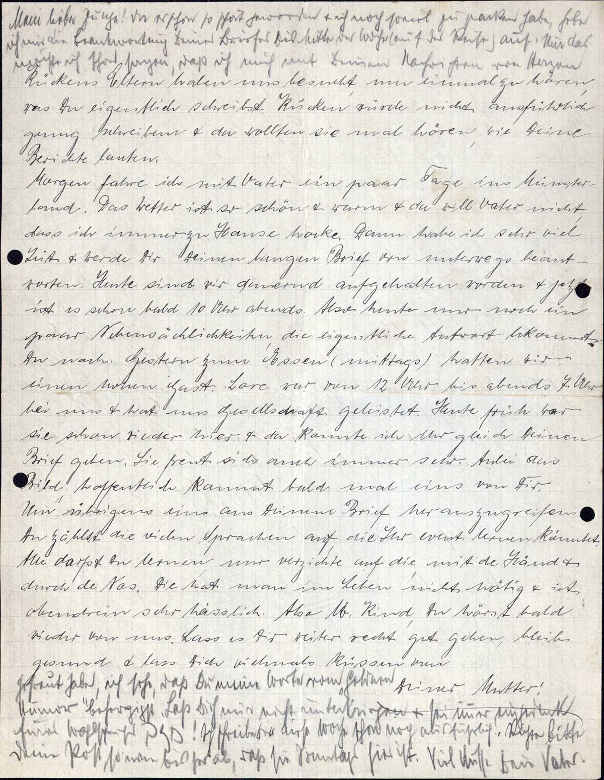Mein lieber Junge! Da es schon so spät geworden & ich noch soviel zu packen habe, hebe ich mir die Beantwortung Deines Briefes bis Mitte der Woche (auf der Reise) auf. Nur das möchte ich schon sagen, daß ich mich mit Deinen Nachrichten von Herzen