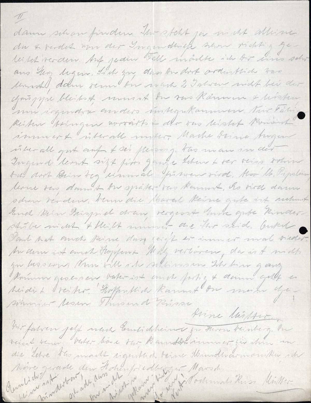 Auch über die moralischen Dinge. Du weißt ja, mein lieber Junge, was ich Dir so oft und eindringlich gesagt habe (obwohl es damals etwas verfrüht war, vielleicht verstehtst Du es heute schon besser! -), „halt die Finger davon -”, Du weißt, was ich meine. Nochmals wiederhole ich es Dir, & wenn Du mal Sorgen hast, wende Dich an Deinen Führer.