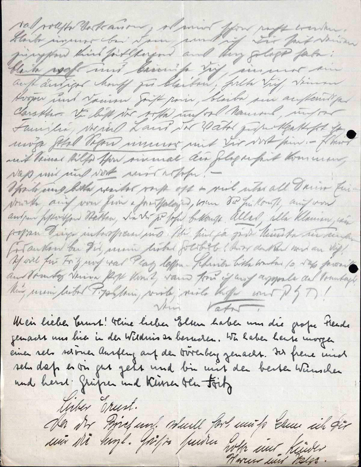 Mein lieber Ernst! Deine lieben Eltern haben uns die große Freude gemacht uns hier in der Wildnis zu besuchen. Wir haben heute morgen einen sehr schönen Ausflug auf den Dörenberg gemacht. Ich freue mich sehr daß es Dir gut geht und bin mit den besten Wünschen und herzl. Grüßen und Küssen Dein Fritz.