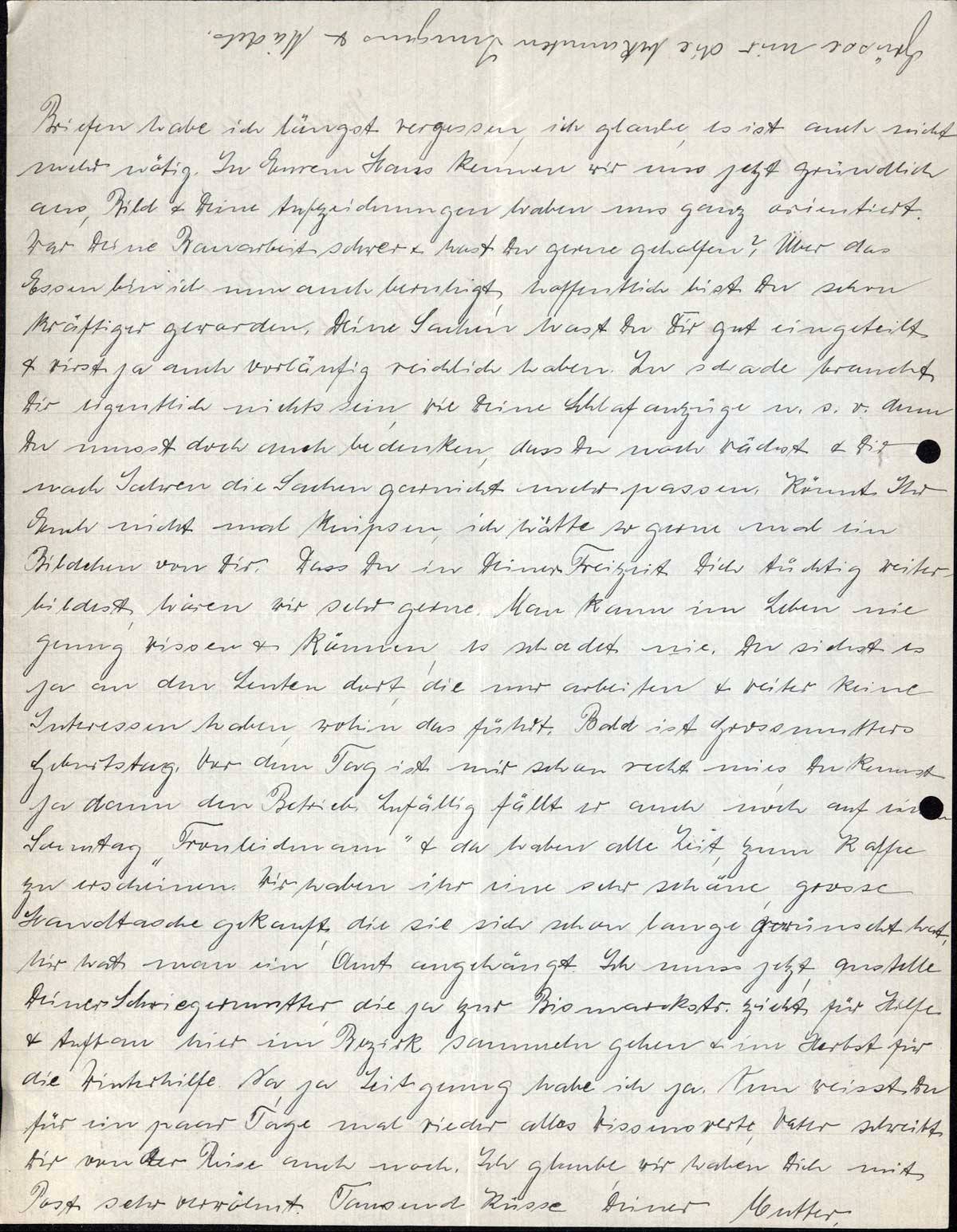 Briefen habe ich längst vergessen, ich glaube, es ist auch nicht mehr nötig. In Eurem Haus kennen wir uns jetzt gründlich aus, Bild & Deine Aufzeichnungen haben uns ganz orientiert. War Deine Bauarbeit schwer & hast Du gerne geholfen? Über das Essen bin ich nun auch beruhigt, hoffentlich bist Du schon kräftiger geworden. Deine Sachen hast Du Dir gut eingeteilt & wirst ja auch vorläufig reichlich haben. Zu schade braucht Dir eigentlich nichts sein, wie Deine Schlafanzüge u.s.w. denn Du musst doch auch bedenken, dass Du noch wächst & Dir nach Jahren die Sachen garnicht mehr passen. Könnt Ihr Euch nicht mal knipsen, ich hätte so gerne mal ein Bildchen von Dir. Dass Du in Deiner Freizeit Dich tüchtig weiterbildest, hören wir sehr gerne. Man kann im Leben nie genug wissen & können, es schadet nie. Du siehst es ja an den Leuten dort, die nur arbeiten & weiter keine Interessen haben, wohin das führt. Bald ist Grossmutters Geburtstag. Vor dem Tag ist mir schon recht mies, Du kennst ja dann den Betrieb. Zufällig fällt er auch noch auf einen Sonntag „Fronleichnam” & da haben alle Zeit, zum Kaffee zu erscheinen. Wir haben ihr eine sehr schöne grosse Handtasche gekauft, die sie sich schon lange gewünscht hat. Mir hat man ein Amt angehängt. Ich muss jetzt, anstelle Deiner Schwiegermutter, die ja zur Bismarckstr. zieht für Hilfe & Aufbau hier im Bezirk sammeln gehen & im Herbst für die Winterhilfe. Na, ja Zeit genug habe ich ja. Nun weisst Du für ein paar Tage mal wieder alles Wissenswerte, Vater schreibt Dir von der Reise auch noch. Ich glaube, wir haben Dich mit Post sehr verwöhnt. Tausend Küsse