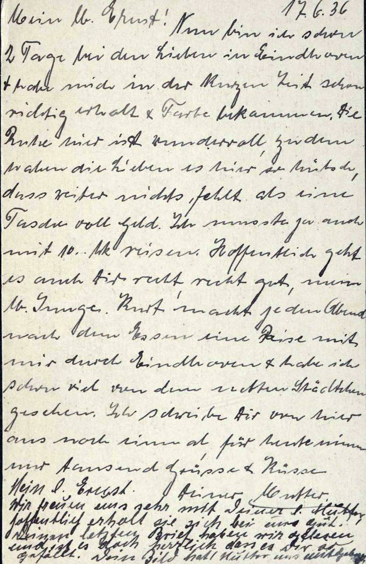 Nun bin ich schon 2 Tage bei den Lieben in Eindhoven & habe mich in der kurzen Zeit schon richtig erholt & Farbe bekommen. Die Ruhe hier ist wundervoll, zudem haben die Lieben es hier so hübsch, dass weiter nichts fehlt als eine Tasche voll Geld. Ich musste ja auch mit 10.- Mk reisen. Hoffentlich geht es auch Dir recht, recht gut, mein lb. Junge. Kurt macht jeden Abend nach dem Essen eine Reise mit mir durch Eindhoven & habe ich schon viel von dem netten Städtchen gesehen. Ich schreibe Dir von hier aus noch einmal, für heute nimm nur tausend Grüsse & Küsse