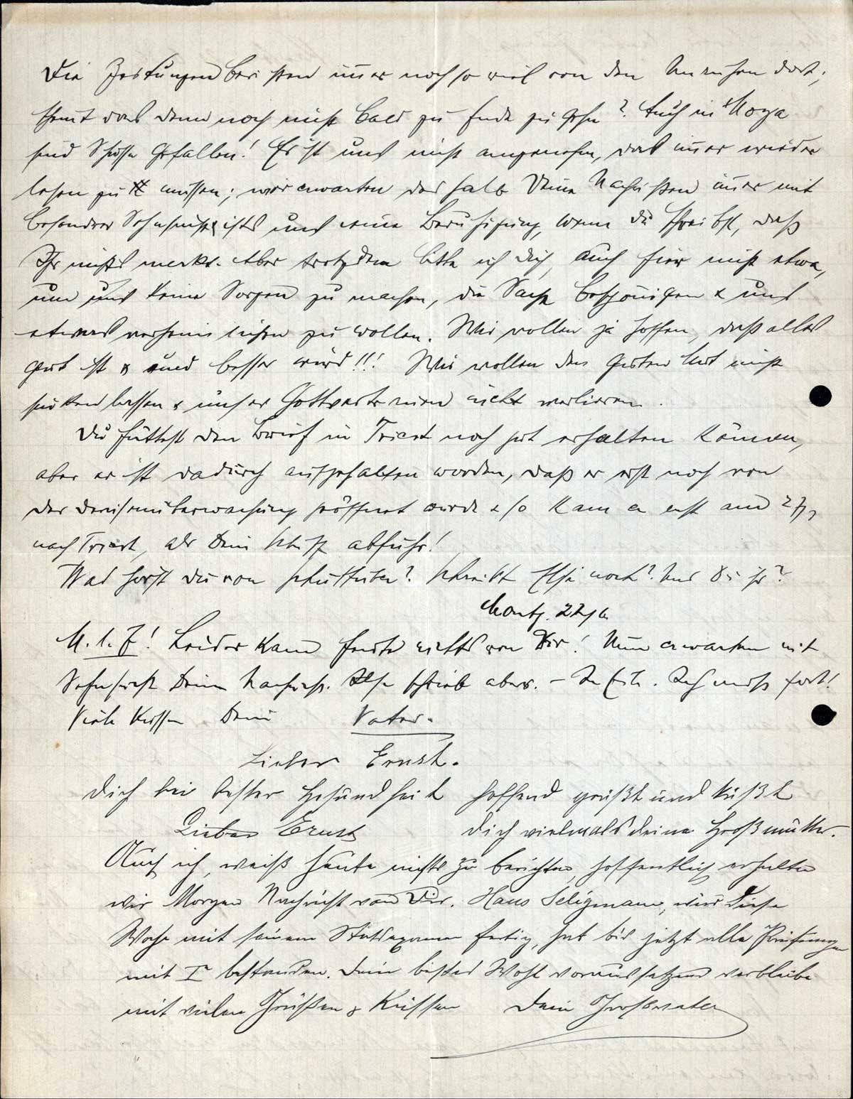 Auch ich weiß heute nichts zu berichten, hoffentlich erhalten wir Morgen Nachricht von Dir. Hans Seligmann wird diese Woche mit seinem Staatsexamen fertig, hat bis jetzt alle Prüfungen mit I bestanden. Dein bestes Wohl voraussetzend verbleibe ich mit vielen Grüßen & Küssen