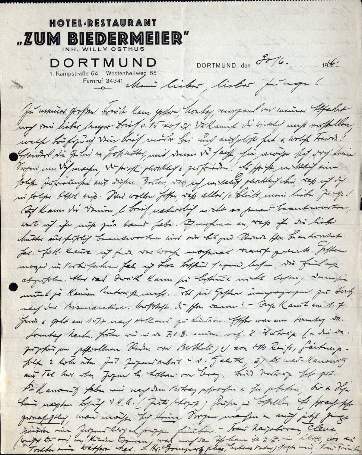 Wegen unserer Reise nach Bayern: wir haben uns in Anbetracht unsrer Dalles & auch verschiedener andrer Dinge, d. h. da es in Kronach & [..] doch für die l. Mutter bei dem dortigen Dalles kein reines Vergnügen ist, entschlossen, daß ich etwa am 12. ds. mit dem D-Zug nach Kronach fahre & dann etwa 8 Tage dort & bei [..] bleibe, um die geschäftlichen Dinge zu erledigen. Ich komme dann wieder zurück & mache es mir mit der l. Mutter daheim etwas bequem & nett. Für die entgangene Reise kann die l. Mutter im August mal mit mir die schon lang versprochene Tour ins Sauerland (Arnsberg - Meffert) mitmachen; sie hat dann bestimmt mehr Freude als in Bayern. Jetzt wo Tante Hilde kein Mädchen hat & alle Arbeit selbst tut, wäre Mutter dann doch immer im Haus & hätte keine Erholung. So mache ich die Sache möglichst kurz. Evtl. - wenn Onkel Carl will - er hat ja auch ein Auto - fahre ich mit ihm nach Weiden & Waidhaus. Eben mal abwarten! - In Holland hat sich Mutti blendend erholt, sie kam mit dicken & roten Backen wieder! Polaks scheinen es sehr schön dort zu haben. Es sind ja auch alles liebe Leute.