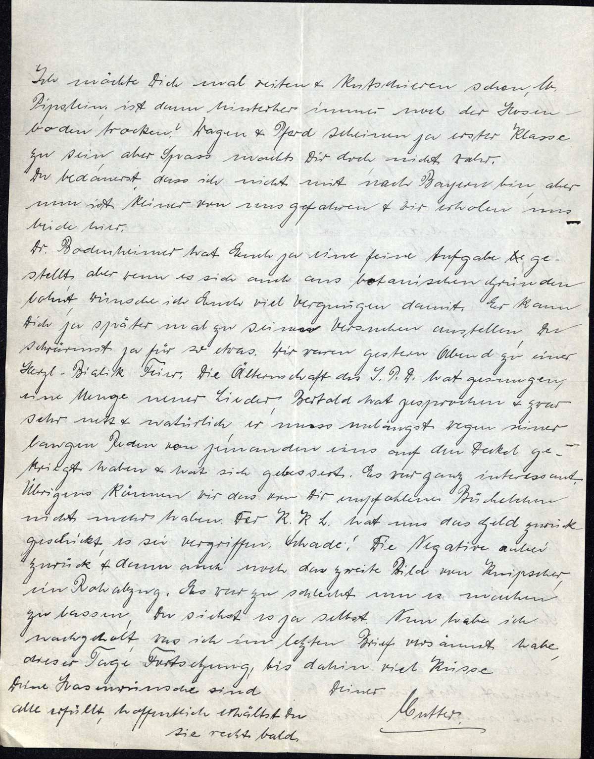 Dr. Bodenheimer hat Euch ja eine feine Aufgabe gestellt, aber wenn es sich auch aus botanischen Gründen lohnt, wünsche ich Euch viel Vergnügen damit. Er kann Dich ja später mal zu seinen Versuchen anstellen, Du schwärmst ja für so etwas. Wir waren gestern Abend zu einer Herzl-Bialik Feier. die Älternschaft des J.P.D. hat gesungen, eine Menge neuer Lieder, Bertold hat gesprochen & zwar sehr nett & natürlich, er muss unlängst wegen seiner langen Reden von jemanden eins auf den Deckel gekriegt haben & hat sich gebessert. Es war ganz interessant. Übrigens können wir das von Dir empfohlene Büchelchen nicht mehr haben. Der K.K.L. hat uns das Geld zurückgeschickt, es sei vergriffen. Schade! Die Negative anbei zurück & dann auch noch das zweite Bild von Knipscher, ein Rohabzug. Es war zu schlecht um es machen zu lassen, Du siehst es ja selbst. Nun habe ich nachgeholt, was ich im letzten Brief versäumt habe, dieser Tage Fortsetzung; bis dahin viele Küsse