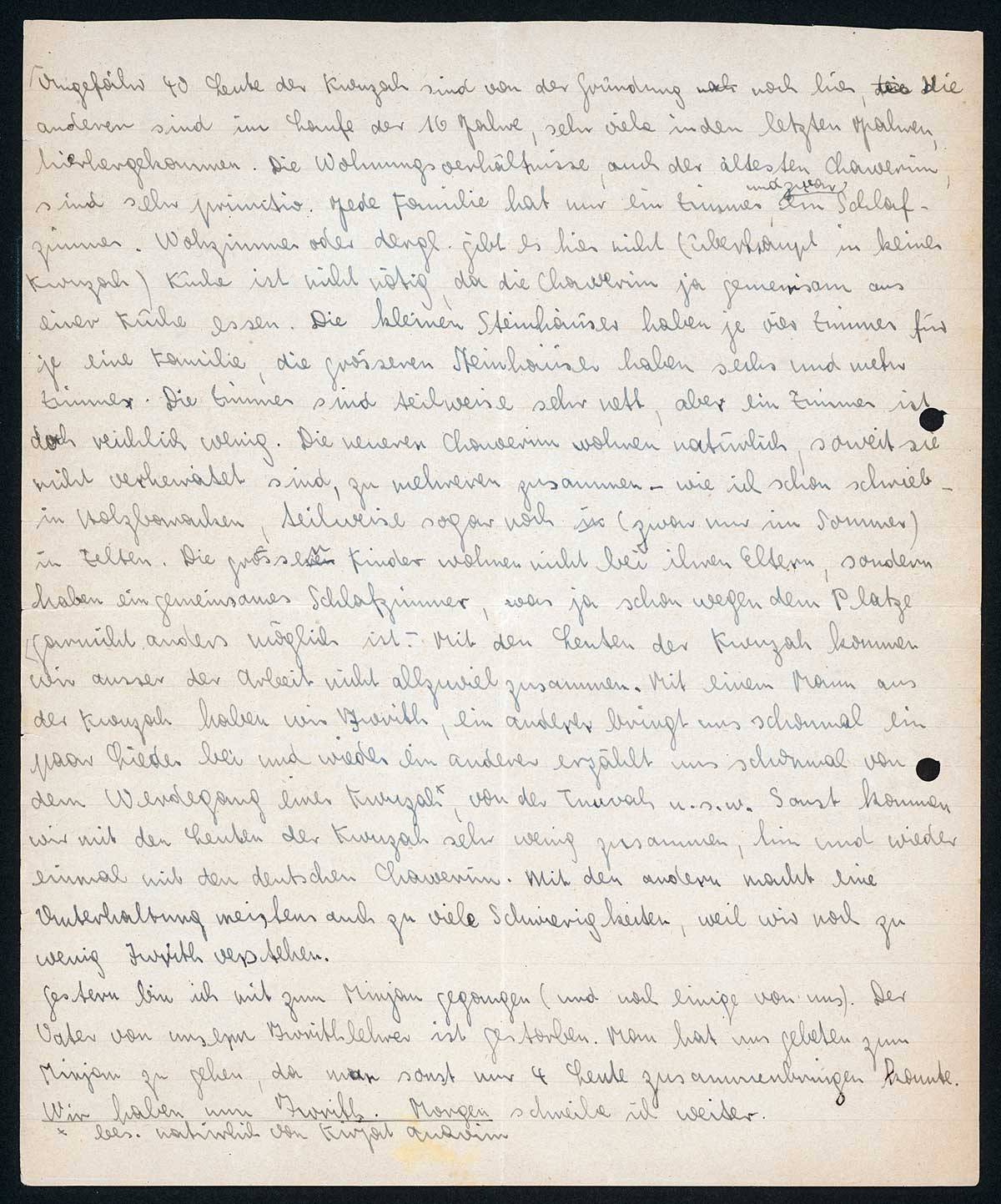Eigentlich hoffte ich, heute Poswt von Euch zu erhalten, erhielt jedoch keine, hoffe aber nun morgen von Euch zu hören. Zuerst will ich nun Deinen Brief, lb. Pips aus Brilon und Geseke beantworten. Du schreibst von einem Herrn, der vor einem halben Jahr einmal hier war und auch in Kirjat Anavim [..]. Dieses existiert aber überhaupt noch garnicht. Man hat wohl einen Plan, eine Mittelstandssiedlung hier anzusiedeln und jetzt dafür schon den Namen [..] (kannst Du's lesen?) Du fragst, ob wir mit den Mädels oft zusammen sind. Alle Kurse und Suchoth (Unterhaltungen, Diskussionen) haben wir natürlich gemeinsam - auch arbeiten wir z. T. gemeinsam miteinander - Ihr wissst ja, dass auch Mädels hier auf dem Felde arbeiten müssen. Auch in der Freizeit sind wir häufig zusammen. Wie das Haus aussieht könnt Ihr Euch nach dem Bilde wohl vorstellen. Leider ist das Bild nur sehr schlecht, so dass das Haus einen schlechteren Eindruck macht, als es ist. Unsere Zimmer sehn folgendermassen aus: