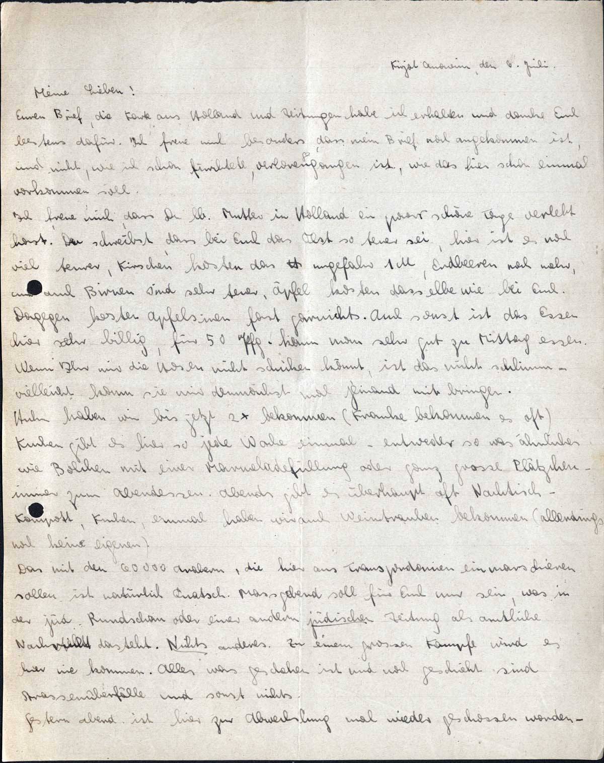 Ich freue mich, dass Du lb. Mutter in Holland ein paar schöne Tage verlebt hast. Du schreibst, dass bei Euch das Obst so teuer ist, hier ist es noch viel teurer, Kirschen kosten das Pfd. ungefähr 1 M, Erdbeeren noch mehr, und auch Birnen sind sehr teuer, Äpfel kosten dasselbe wie bei Euch. Dagegen kosten Apfelsinen fast garnichts. Auch sonst ist das Essen hier sehr billig, für 50 Pfg. kann man sehr gut zu Mittag essen. Wenn Ihr mir die Hosen nicht schicken könnt, ist das nicht schlimm - vielleicht kann sie mir demnächst mal jemand mitbringen.