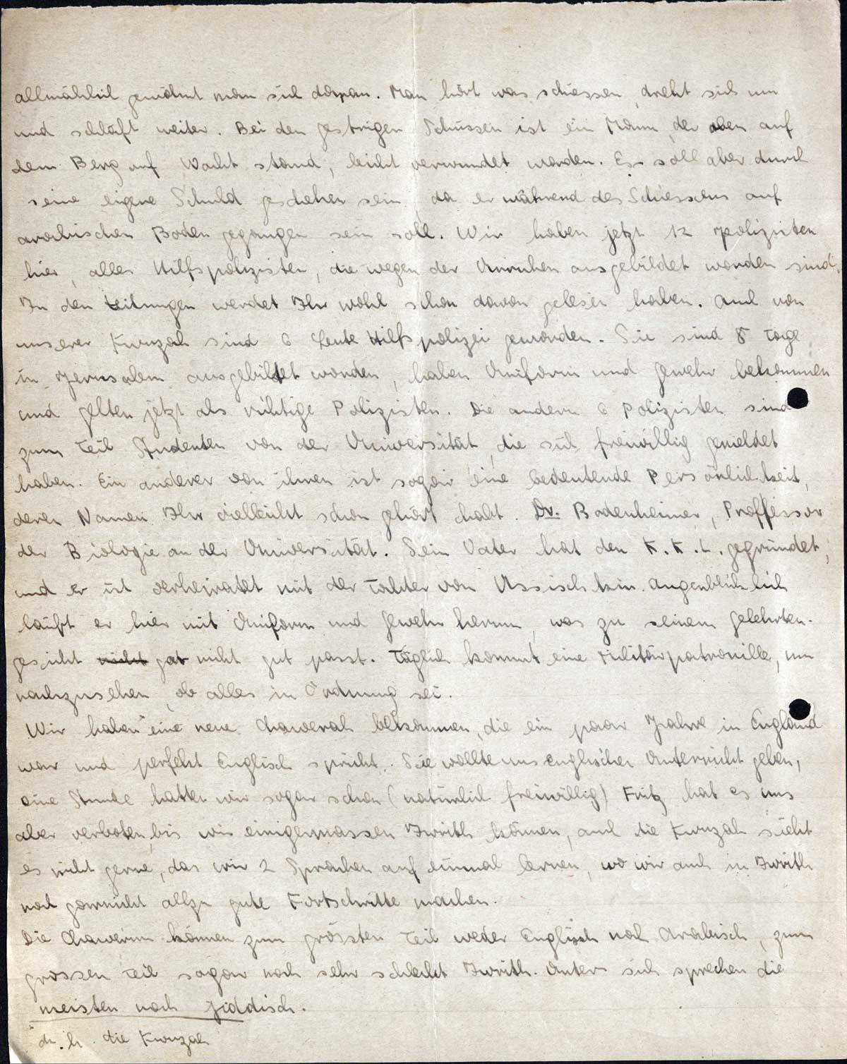 Das mit den 60 000 Arabern, die hier aus Transjordanien einmarschieren sollen, ist natürlich Quatsch. Massgebend soll für Euch nur sein, was in der jüd. Rundschau oder einer andern jüdischen Zeitung als amtliche Nachricht dasteht. Nichts anderes. Zu einem grossen Kampfe wird es hier nie kommen. Alles was geschehen ist und noch geschieht sind Strassenüberfälle und sonst nichts.