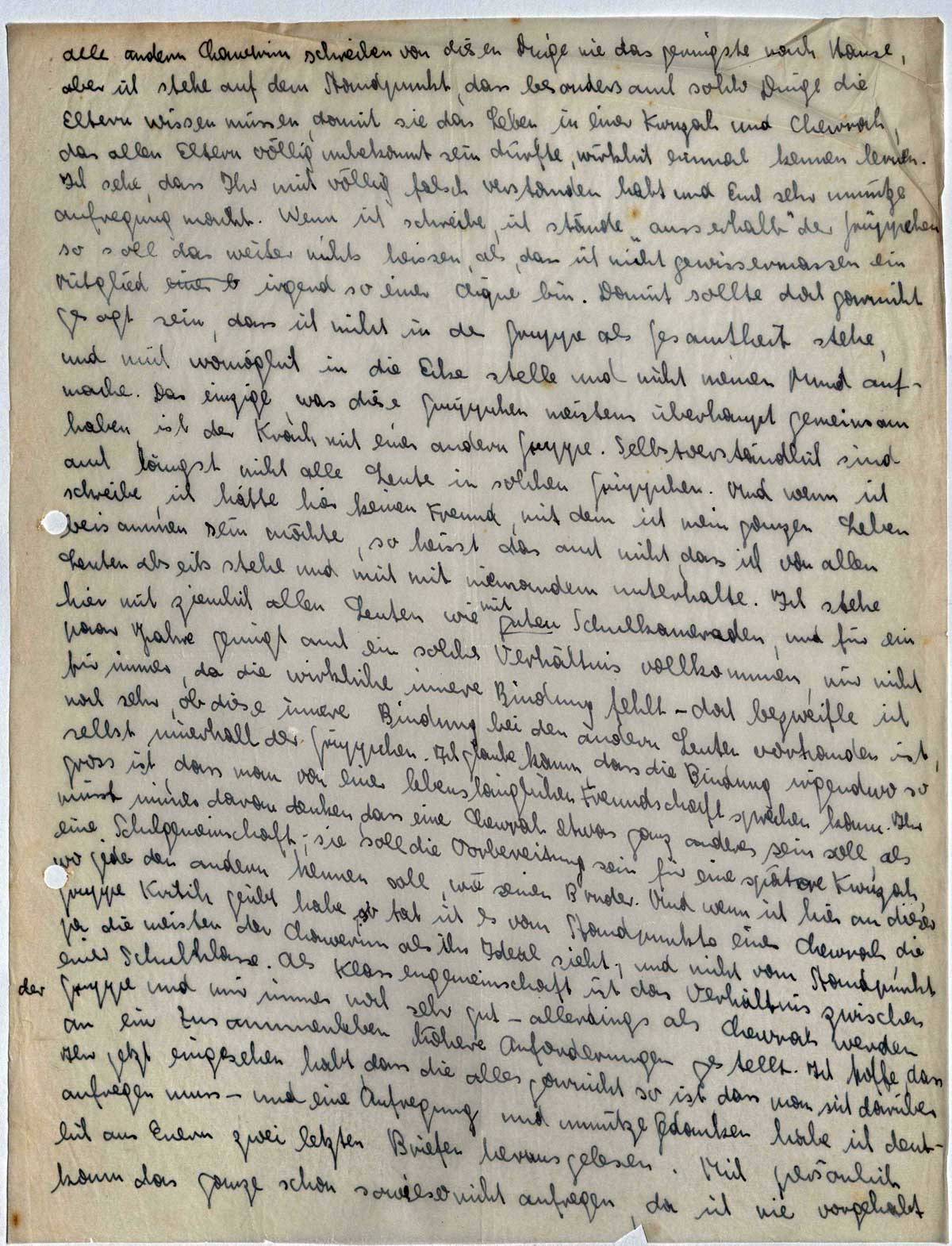 Alle andern Chawerim schreiben von diesen Dinge nie das geringste nach Hause, aber ich stehe auf dem Standpunkt, dass besonders auch solche Dinge die Eltern wissen müssen, damit sie das Leben in einer Kwuzah und Chewrah, das allen Eltern völlig unbekannt sein dürfte, wirklich einmal kennen lernen. Ich sehe, dass Ihr mich völlig falsch verstanden habt und Euch sehr unnütze Aufregung macht. Wenn ich schreibe, ich stände „ausserhalb” der Grüppchen, so soll das weiter nichts heissen, als, dass ich nicht gewissermassen ein Mitglied irgend so einer Clique bin. Damit sollte doch garnicht gesagt sein, dass ich nicht in der Gruppe als Gesamtheit stehe, und mich womöglich in die Ecke stelle und nicht meinen Mund aufmache. Das einzige, was diese Grüppchen meistens überhaupt gemeinsam haben, ist der Krach mit einer andern Gruppe. Selbstverständlich sind auch längst nicht alle Leute in solchen Grüppchen. Und wenn ich schreibe, ich hätte hier keinen Freund, mit dem ich mein ganzen Leben beisammen sein möchte, so heisst das auch nicht, dass ich von allen Leuten abseits stehe und mich mit niemandem unterhalte. Ich stehe hier mit ziemlich allen Leuten wie mit guten Schulkameraden, und für ein paar Jahre genügt auch ein solches Verhältnis vollkommen, nur nicht für immer, da die wirkliche innere Bindung fehlt - doch bezweifle ich noch sehr, ob diese innere Bindung bei den andern Leuten vorhanden ist, selbst innerhalb der Grüppchen. Ich glaube kaum, dass die Bindung irgendwo so gross ist, dass man von einer lebenslänglichen Freundschaft sprechen kann. Ihr müsst immer daran denken, dass eine Chewrah etwas ganz anderes sein soll, als eine Schulgemeinschaft; sie soll die Vorbereitung sein für eine spätere Kwuzah, wo jeder den andern kennen soll, wie seinen Bruder. Und wenn ich hier an dieser Gruppe Kritik geübt habe, so tat ich es vom Standpunkte einer Chewrah, die ja die meisten der Chawerim als ihr Ideal sieht, und nicht vom Standpunkt einer Schulklasse. Als Klassengemeinschaft ist das Verhältnis zwischen der Gruppe und mir immer noch sehr gut - allerdings als Chewrah werden an ein Zusammenleben höhere Anforderungen gestellt. Ich hoffe, dass Ihr jetzt eingesehen habt, dass die alles garnicht so ist, dass man sich darüber aufregen muss - und eine Aufregung und unnütze Gedanken habe ich deutlich aus Euern zwei letzten Briefen herausgelesen. Mich persönlich kann das ganze schon sowieso nicht aufregen, da ich nie vorgehabt