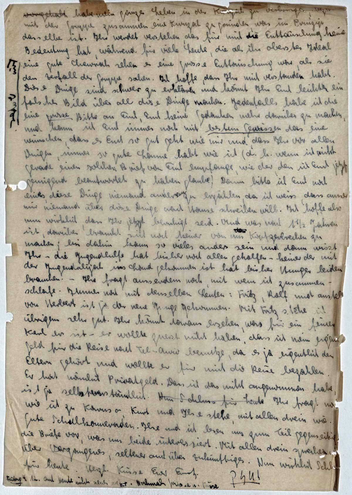 habe mein ganzes Leben in der Kwuzah zu verbringen, bezw. mit der Gruppe zusammen eine Kwuzah zu gründen, was im Prinzip dasselbe ist. Ihr werdet verstehen, das für mich die Enttäuschung keine Bedeutung hat, während für viele Leute, die als ihr oberstes Ideal eine gute Chewrah sehen es eine grosse Enttäuschung war, als sie den Zerfall der Gruppe sahen. Ich hoffe, dass Ihr mich verstanden habt. Diese Dinge sind schwer zu erklären und könnt Ihr Euch leicht ein falsches Bild über all diese Dinge machen. Jedenfalls habe ich die eine grosse Bitte an Euch, Euch keine Gedanken mehr darüber zu machen, und kann ich Euch immer noch mit bestem Gewissen das eine wünschen, dass es Euch so gut geht wie mir und, dass Ihr vor allen Dingen, immer so gute Laune habt wie ich (d. h. wenn ich nicht gerade einen solchen Brief von Euch empfange, wie der, den ich Euch jetzt genügend beantwortet zu haben glaube). Dann bitte ich Euch noch eines, diese Dinge niemand anderem zu erzählen, da ich weiss, dass ausser mir niemand über diese Dinge nach Hause schreiben will. Ich hoffe also nun wirklich, dass Ihr jetzt beruhigt seid. Und was nach 1 ½ Jahren ist, darüber braucht sich noch keiner von uns Kopfzerbrechen zu machen; bis dahin kann so vieles anders sein und dann wisst Ihr - die Jugendhilfe hat bisher noch allen geholfen - keiner der mit der Jugendalijah ins Land gekommen ist hat bisher Hunger leiden brauchen. - Ihr fragt ausserdem noch, mit wem ich zusammen schlafe. Immer noch mit denselben Leuten: Fritz, Rolf und anstelle von Herbert ist ja der neue Junge bekommen. Mit Fritz stehe ich übrigens sehr gut. Ihr könnt daraus ersehen, was für ein feiner Kerl er ist - er wollte zuerst nicht haben, dass ich mein eigenes Geld für die Reise nach Tel-Aviv benutze, da es ja eigentlich den Eltern gehört, und wollte er für mich die Reise bezahlen. Er hat nämlich Privatgeld. Dass ich das nicht angekommen habe, ist ja selbstverständlich. Ihr fragt noch wie ich zu Karuso, Kurt und Ilse stehe, mit allen drein wie gute Schulkameraden. Ilse und ich lesen uns zum Teil gegenseitig die Briefe vor, was uns beide interessiert. Mit allen drein spreche ich über Vergangenes, seltener auch über Zukünftiges. Nun wirklich Schluss für heute.