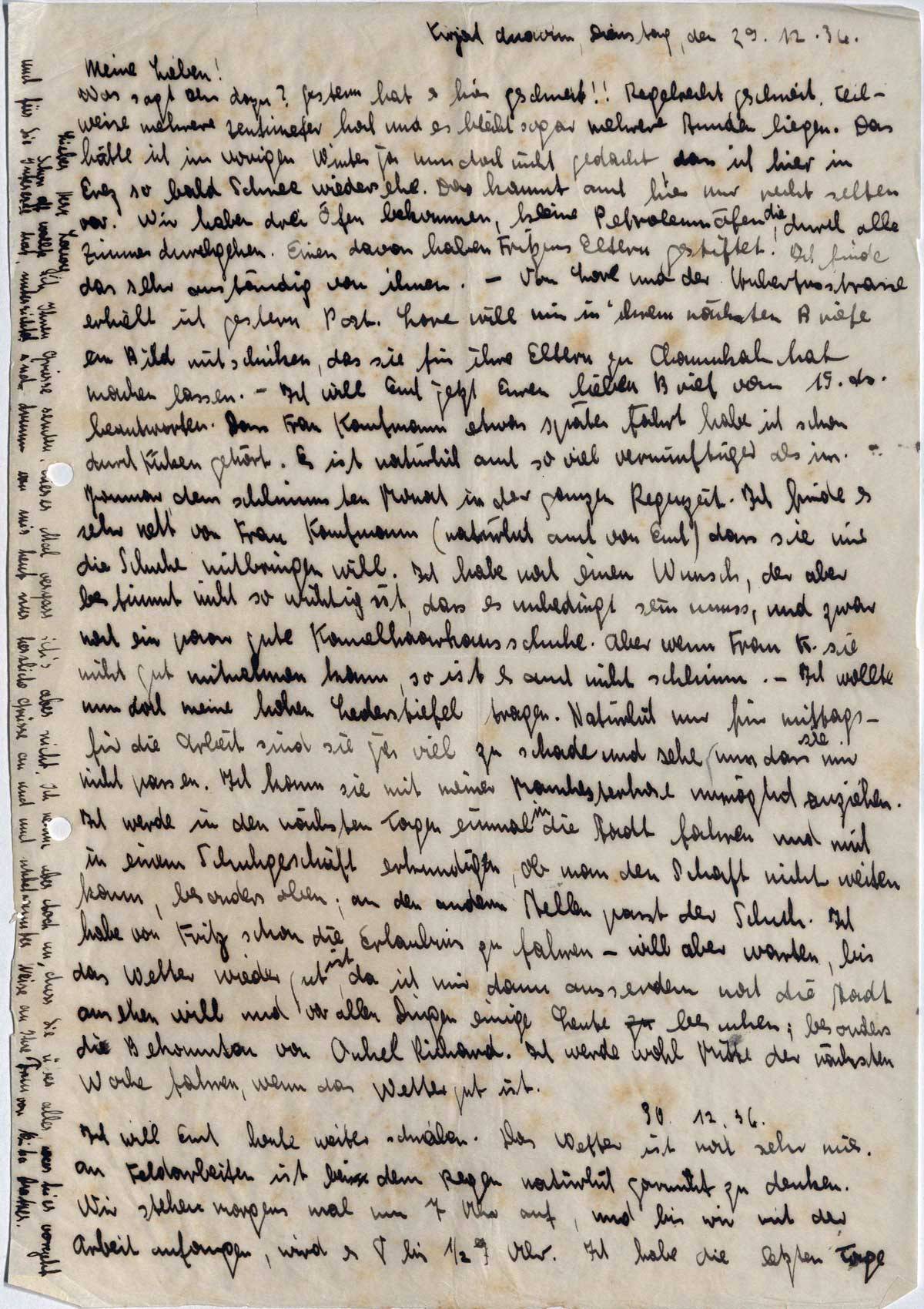 Was sagt Ihr dazu? Gestern hat es hier geschneit!! Regelrecht geschneit. Teilweise mehrere Zentimeter hoch und es bleibt sogar mehrere Stunden liegen. Das hätte ich im vorigen Winter ja nun doch nicht gedacht, dass ich hier in Erez so bald Schnee wiedersehe. Das kommt auch hier nur recht selten vor. Wir haben drei Öfen bekommen, kleine Petroleumöfen, die durch alle Zimmer durchgehen. Einen davon haben Fritzens Eltern gestiftet. Ich finde das sehr anständig von ihnen. - Von Lore und der Hubertusstrasse erhielt ich gestern Post. Lore will nun in ihrem nächsten Briefe ein Bild mitschicken, das sie für ihre Eltern zu Chanukah hat machen lassen. - Ich will Euch jetzt Euren lieben Brief vom 15. ds. beantworten. Dass Frau Kaufmann etwas später fährt habe ich schon durch Küken gehört. Es ist natürlich auch so viel vernünftiger als im Januar, dem schlimmsten Monat in der ganzen Regenzeit. Ich finde es sehr nett von Frau Kaufmann (natürlich auch von Euch) dass sie mir die Schuhe mitbringen will. Ich habe noch einen Wunsch, der aber bestimmt nicht so wichtig ist, dass es unbedingt sein muss, und zwar noch ein paar gute Kamelhaarhausschuhe. Aber wenn Frau K. sie nicht gut mitnehmen kann, so ist es auch nicht schlimm. - Ich wollte nun doch meinen hohen Lederstiefel tragen. Natürlich nur für mittags - für die Arbeit sind sie ja viel zu schade und sehe nun, dass sie mir nicht passen. Ich kann sie mit meiner Manchesterhose unmöglich anziehen. Ich werde in den nächsten Tagen einmal in die Stadt fahren und mich in einem Schuhgeschäft erkundigen, ob man den Schaft nicht weiten kann, besonders oben; an den andern Stellen passt der Schuh. Ich habe von Fritz schon die Erlaubnis zu fahren - will aber warten, bis das Wetter wieder gut ist, da ich mir dann ausserdem noch die Stadt ansehen will und vor allen Dingen einige Leute besuchen; besonders die Bekannten von Onkel Richard. Ich werde wohl Mitte der nächsten Woche fahren, wenn das Wetter gut ist.