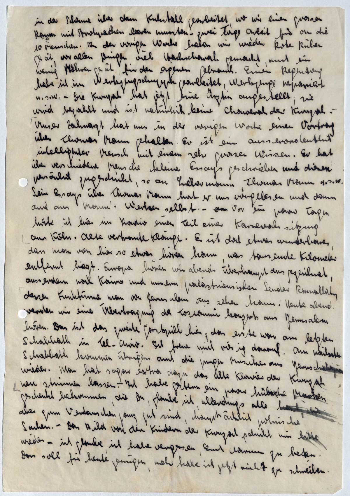 in der Scheune über dem Kuhstall gearbeitet, wo wir einen grossen Raum mit Strohpacken leeren mussten - zwei Tage Arbeit für an die 10 Menschen. In der vorigen Woche haben wir wieder Rote Rüben gesät, vor allen Dingen viel Hachscharah gemacht, auch ein wenig Möhren gesät, für den eigenen Gebrauch. Einen Regentag habe ich im Werkzeugschuppen gearbeitet, Werkzeuge repariert u.s.w. - Die Kwuzah hat jetzt eine Ärztin angestellt; sie wird bezahlt und ist natürlich keine Chawerah der Kwuzah. - Unser Zahnarzt hat uns in der vorigen Woche einen Vortrag über Thomas Mann gehalten. Er ist ein ausserordentlich intelligenter Mensch, mit einem sehr grossen Wissen. Er hat über verschiedene Menschen kleine Essays geschrieben und diesen persönlich zugeschickt, so an Liebermann, Thomas Mann u.s.w. Sein Essays über Thomas Mann hat er uns vorgelesen und dann auch aus Mann's Werken selbst. - Vor ein paar Tagen hörte ich hier im Radio einen Teil einer Karnevalssitzung aus Köln. Alte vertraute Klänge. Es ist doch etwas wunderbares, dass man von hier so etwas hören kann, was tausende Kilometer entfernt liegt. Europa hören wir abends überhaupt ausgezeichnet, ausserdem noch Kairo und unsern palästinensischen Sender Ramallah, dessen Funktürme man von Jerusalem aus sehen kann. Heute abend werden wir eine Übertragung des Toscaninikonzerts aus Jerusalem hören. Das ist das zweite Gastspiel hier; das erste war am letzten Schabbath in Tel-Aviv. Ich freue mich riesig darauf. Am nächsten Schabbath kommen übrigens auch die jungen Musiker aus Jeruschalajim wieder. Man hat sogar extra dazu das alte Klavier der Kwuzah neu stimmen lassen. - Ich habe gestern ein paar hübsche Marken geschenkt bekommen, die Du, glaube ich, allerdings alle hast, die aber zum Vertauschen ganz gut sind, hauptsächlich polnische Sachen. - Das Bild von den Kindern der Kwuzah schickt mir bitte wieder - ich glaube, ich habe vergessen, Euch darum zu beten. Dass soll für heute genügen, mehr habe ich jetzt nicht zu schreiben.