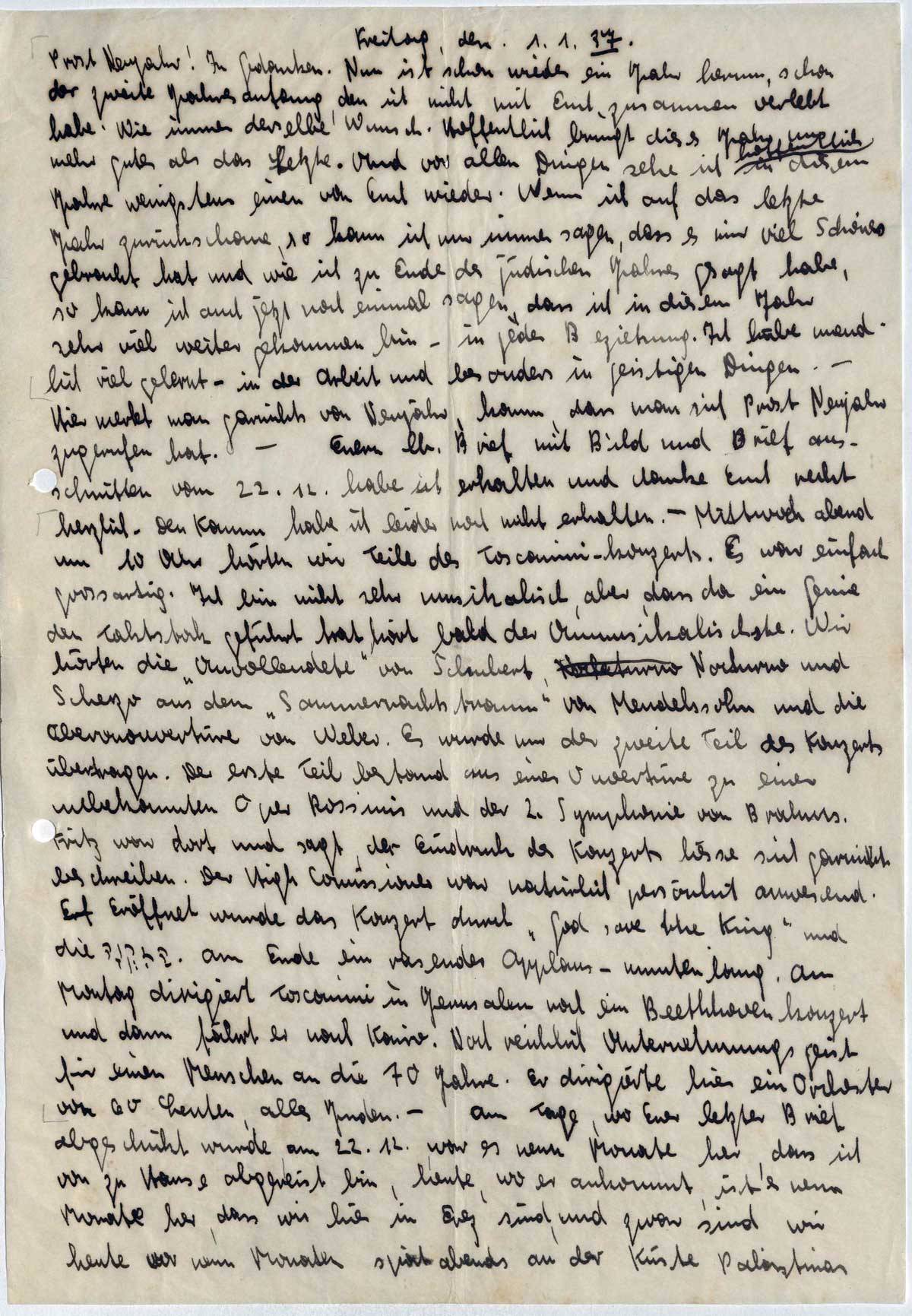 Prost Neujahr! In Gedanken. Nun ist schon wieder ein Jahr herum, schon der zweite Jahresanfang, den ich nicht mit Euch zusammen verlebt habe. Wie immer derselbe Wunsch. Hoffentlich bringt dieses Jahr uns mehr gutes als das Letzte. Und vor allen Dingen sehe ich hoffentlich in diesem Jahre wenigstens einen von Euch wieder. Wenn ich auf das letzte Jahr zurückschaue, so kann ich nur immer sagen, dass es mir viel Schönes gebracht hat und wie ich zu Ende des jüdischen Jahres gesagt habe, so kann ich auch jetzt noch einmal sagen, dass ich in diesem Jahr sehr viel weiter gekommen bin - in jeder Beziehung. Ich habe unendlich viel gelernt - in der Arbeit und besonders in geistigen Dingen. - Hier merkt man garnichts von Neujahr, kaum, dass man sich Prost Neujahr zugerufen hat. - Euern lb. Brief mit Bild und Briefausschnitten vom 22.12. habe ich erhalten und danke Euch recht herzlich. Den Kamm habe ich leider noch nicht erhalten. - Mittwoch abend um 10 Uhr hörten wir Teile des Toscanini-konzerts. Es war einfach grossartig. Ich bin nicht sehr musikalisch, aber, dass da ein Genie den Taktstock geführt hat, hört bald der Unmusikalischste. Wir hörten die „Unvollendete” von Schubert, Nocturno und Scherzo aus dem „Sommernachtstraum” von Mendelssohn und die Oberonouvertüre von Weber. Es wurde nur der zweite Teil des Konzerts übertragen. Der erste Teil bestand aus einer Ouvertüre zu einer unbekannten Oper Rossinis und der 2. Symphonie von Brahms. Fritz war dort und sagt, der Eindruck des Konzerts liesse sich garnicht beschreiben. Der High Comissioner war natürlich persönlich anwesend. Eröffnet wurde das Konzert durch „God save the King” und die [..]. Am Ende ein rasender Applaus - minutenlang. Am Montag dirigiert Toscanini in Jerusalem noch ein Beethovenkonzert und dann fährt er nach Kairo. Noch reichlich Unternehmungsgeist für einen Menschen an die 70 Jahre. Er dirigierte hier ein Orchester von 60 Leuten, alles Juden. - Am Tage, wo Euer letzter Brief abgeschickt wurde, am 22.12., war es neun Monate her, dass ich von zu Hause abgereist bin, heute, wo er ankommt, ist es neun Monate her, dass wir hier in Erez sind, und zwar sind wir heute vor neun Monaten spät abends an der Küste Palästinas
