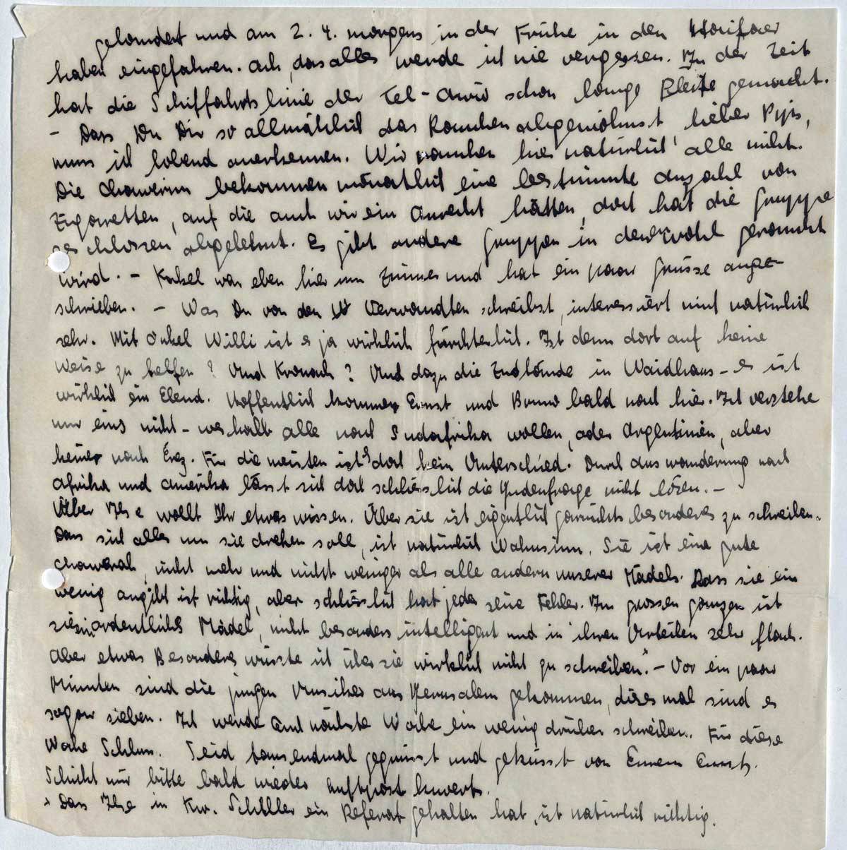 gelandet und am 2.4. morgens in der Frühe in den Haifaer Hafen eingefahren. Ach, das alles werde ich nie vergessen. In der Zeit hat die Schiffahrtslinie der Tel-Aviv schon lange Pleite gemacht. - Dass Du Dir so allmählich das Rauchen abgewöhnst, lieber Pips, muss ich lobend anerkennen. Wir rauchen hier natürlich alle nicht. Die Chawerim bekommen monatlich eine bestimmte Anzahl von Zigaretten, auf die auch wir ein Anrecht hätten, doch hat die Gruppe geschlossen abgelehnt. Es gibt andere Gruppen in denen wohl geraucht wird. - Kakel war eben hier im Zimmer und hat ein paar Grüsse angeschrieben. - Was Du von den Verwandten schreibst, interessiert mich natürlich sehr. Mit Onkel Willi ist es ja wirklich fürchterlich. Ist denn dort auf keine Weise zu helfen? Und Kronach? Und dazu die Zustände in Waidhaus - es ist wirklich ein Elend. Hoffentlich kommen Ernst und Bruno bald nach hier. Ich verstehe nur eins nicht - weshalb alle nach Südafrika wollen, oder Argentinien, aber keiner nach Erez. Für die meisten ist es doch kein Unterschied. Durch Auswanderung nach Afrika und Amerika lässt sich doch schliesslich die Judenfrage nicht lösen. -