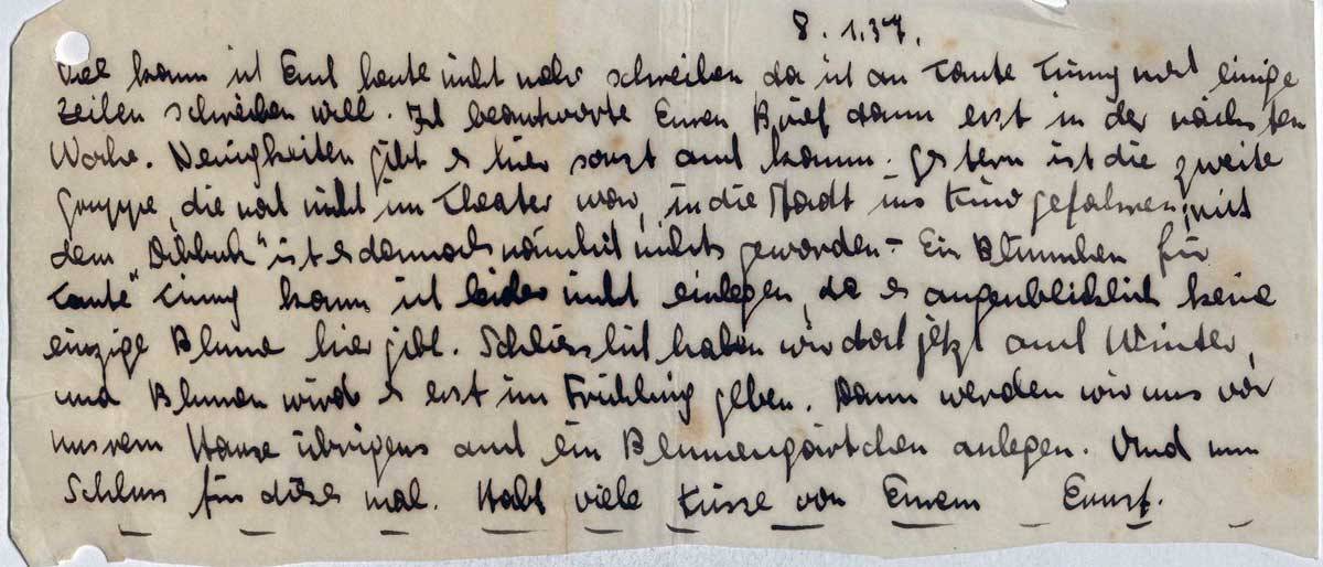 Viel kann ich Euch heute nicht mehr schreiben, da ich an Tante Tinny noch einige Zeilen schreiben will. Ich beantworte Euren Brief dann erst in der nächsten Woche. Neuigkeiten gibt es hier sonst auch kaum. Gestern ist die zweite Gruppe, die noch nicht im Theater war, in die Stadt ins Kino gefahren; mit dem „Dibbuk” ist es damals nämlich nichts geworden. - Ein Blümchen für Tante Tinny kann ich leider nicht einlegen, da es augenblicklich keine einzige Blume hier gibt. Schliesslich haben wir doch jetzt auch Winter, und Blumen wird es erst im Frühling geben. Dann werden wir uns vor unsrem Hause übrigens auch ein Blumengärtchen anlegen. Und nun Schluss für dieses mal. Habt viele Küsse von Eurem Ernst.