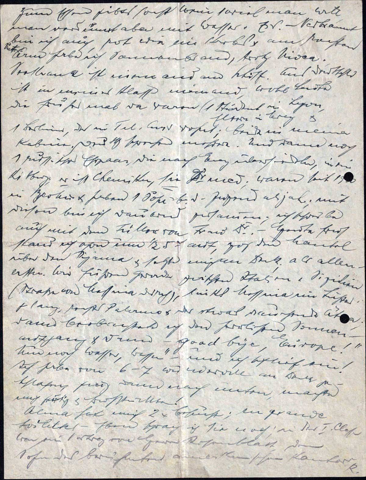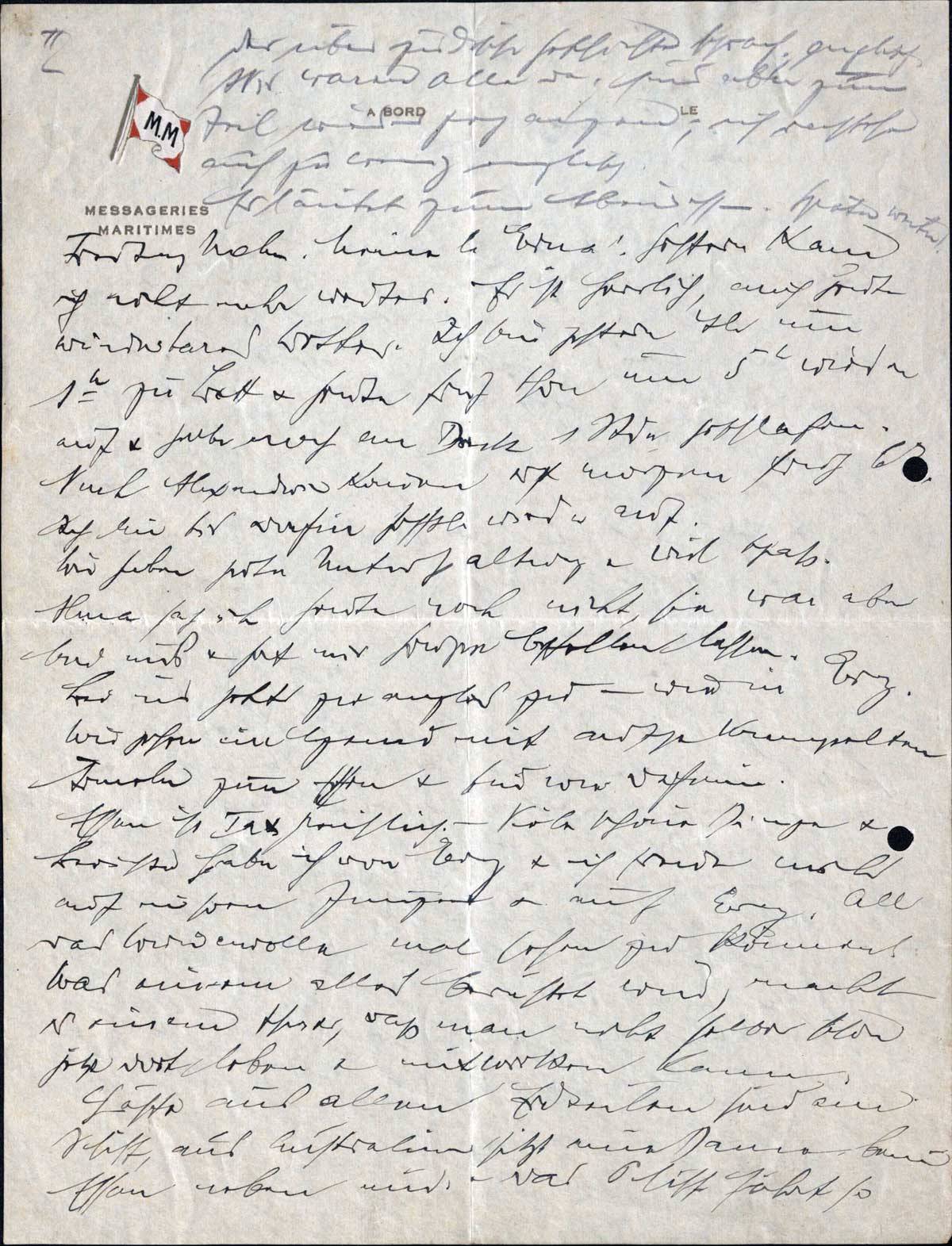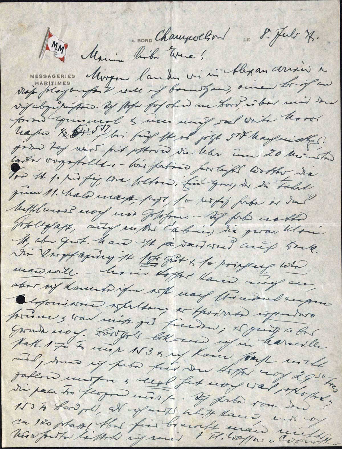 Morgen landen wir in Alexandrien an. Diese Gelegenheit will ich benutzen, einen Brief an Dich abzurichten. Ich stehe hoch oben an Bord, über mir den freien Himmel & um mich das weite Meer. Nachm. 5.37; bei Euch ist es jetzt 5.17 nachmittags; jeden Tag wird seit gestern die Uhr um 20 Minuten weiter vorgestellt. - Wir haben herrliches Wetter, die See ist so ruhig, wie selten. Ein Herr, der die Fahrt zum 11. Male macht, sagt, so ruhig habe er das Mittelmeer noch nie gesehen. - Ich habe nette Gesellschaft, auch in der Cabine, die zwar klein ist, aber gut. Man ist ja dauernd auf Deck. Die Verpflegung ist sehr gut & so reichlich, wie man will. - Mein Koffer kam auch an, aber ich konnte ihn erst nach stundenlangem telefonieren erhalten; er [..] irgendwo herum & war nicht zu finden; es ging aber gerade noch. Bordgeld bekam ich in Marseille statt 170 Frs nur 153 & ich kann sonst nicht aus, denn ich habe für den Koffer noch 29.30 Frs zahlen müssen & alles hat noch was gekostet. Die paar Frs flogen nur so. Ich habe von den 153 Frs Bordgeld, als ich aufs Schiff kam, nur noch ca 120 gehabt. Aber hier braucht man nichts. Nur heute leistete ich mir 1 Fl. Wasser u. Cigaretten.