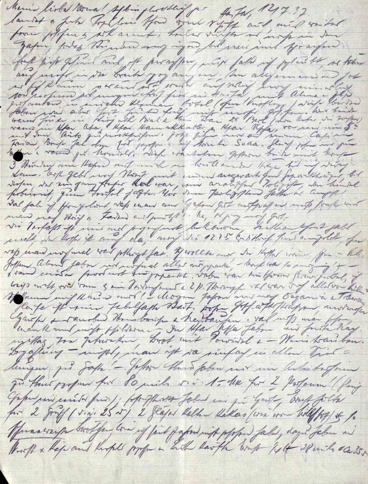 Dann wurde [..] eingepackt. Dabei war ein schöner [..], ich weiß nicht, von wem & ein Seidenhemd & 2 P. Strümpfe. Das war doch alles von Küken? Ich kenne mich kaum aus! - Morgen fahren wir nach [..] & [..]. Haifa ist eine fabelhafte Stadt. Große Geschäftsstraßen, modernste Häuser & [..] & Neubauten. Was muß man sehen, man kanns nicht schildern. - In Kfar Uscha haben wir heute Nachmittag Tee getrunken, Brot mit Powidl + - Weintrauben. Bezahlung - nichts, man ist da einfach in allen Siedlungen zu Gast! - Gestern Abend haben wir im Arbeiterheim zu Abend gegessen für 80 mils d. i. 1.- Mk für 2 Personen! (Gleich [..] wir wieder hier); [..] haben wir zu Hauf, Ernst holte für 2 Grusch ( d. s. 25 Pf.) 2 Gläser kalten Kakao (wie vom Milchhof) & so schneeweiße Brötchen, wie ich seit Jahren nicht gesehen habe, dazu haben wir Wurst & Käse aus Krefeld gegessen & Butter kaufte Ernst ¼ Pfd. 28 mils ca 35 Pf.