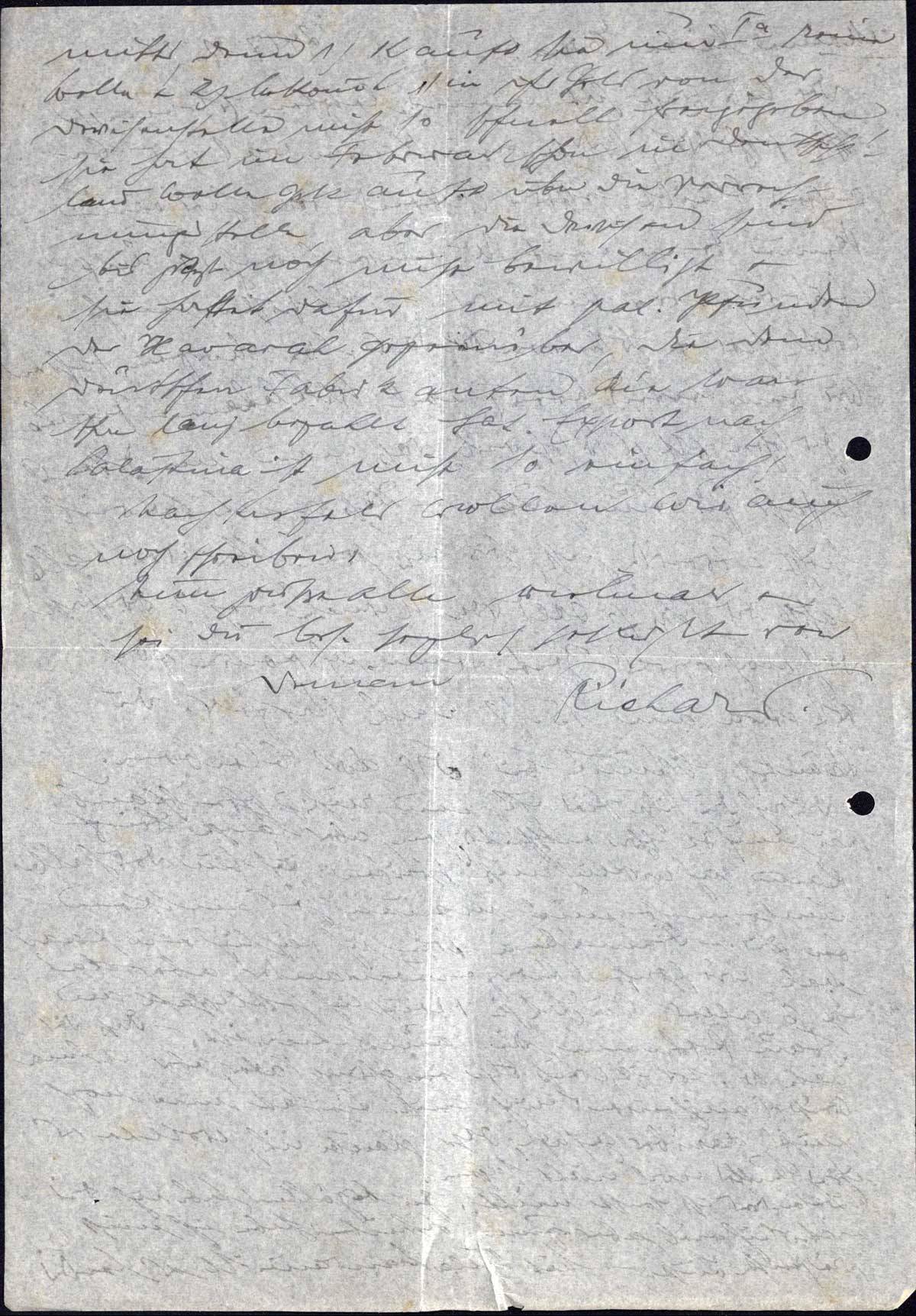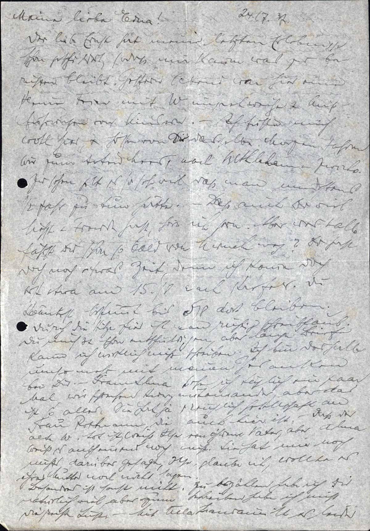 Durch die Hitze hier ist man richtig schreibfaul. Du mußt schon entschuldigen, aber lange Briefe kann ich wirklich nicht schreiben. Ich bin deshalb umso mehr mit meinen Gedanken bei Dir. - [..] sehe ich täglich ein paar Mal, wir sprechen [..] miteinander, aber das ist so alles. Sie hat ja reichlich Gesellschaft an Frau Rothmann, die auch hier ist. - Daß der alte W. tot ist, weiß Ilse von ihrem Vater, aber Alma weiß es anscheinend noch nicht. Sie hat mir noch nichts darüber gesagt. Ilse, glaube ich, wollte es ihrer Mutter noch nicht sagen.