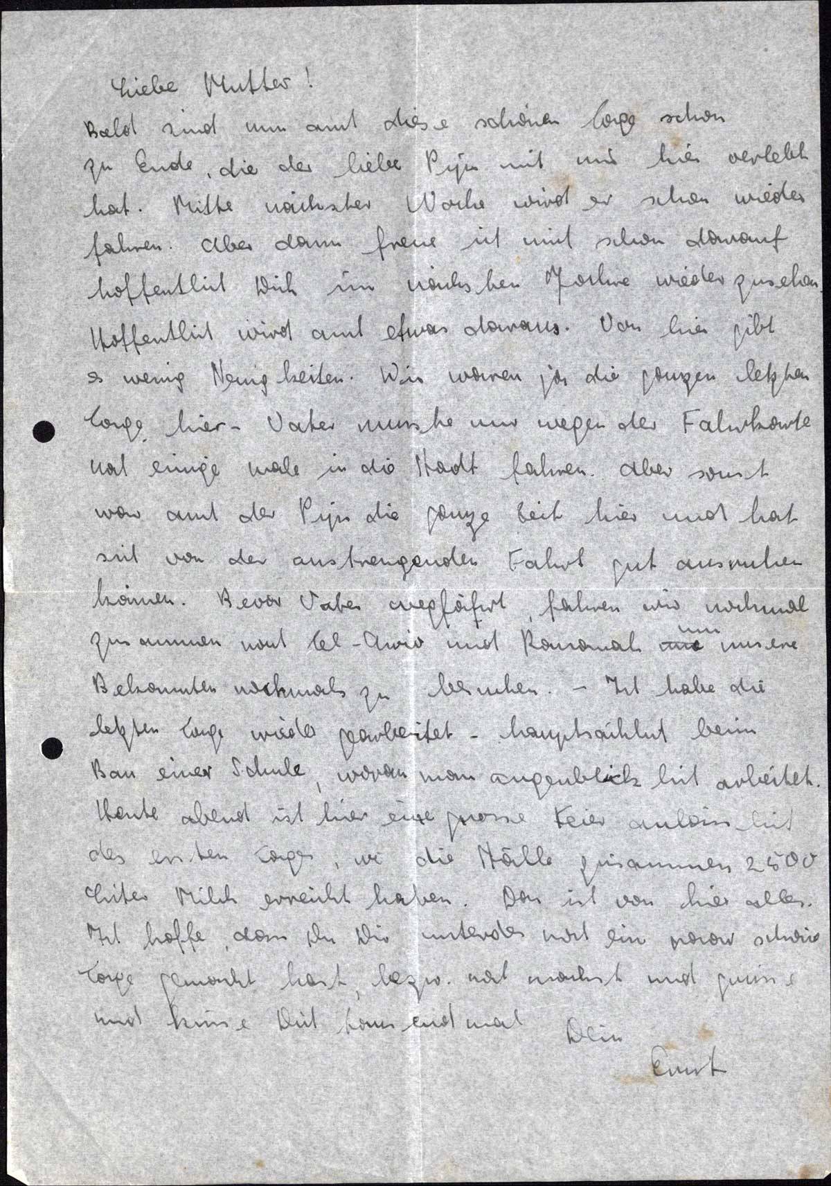 Bald sind nun auch diese schönen Tage schon zu Ende, die der liebe Pips mit mir hier verlebt hat. Mitte nächster Woche wird er schon wieder fahren. Aber dann freue ich mich schon darauf hoffentlich Dich im nächsten Jahre wiederzusehen. Hoffentlich wird auch etwas daraus. Von hier gibt es wenig Neuigkeiten. Wir waren ja die ganzen letzten Tage hier - Vater musste nur wegen der Fahrkarte noch einige Male in die Stadt fahren. Aber sonst war auch der Pips die ganze Zeit hier und hat sich von der anstrengenden Fahrt gut ausruhen können. Bevor Vater wegfährt, fahren wir nochmal zusammen nach Tel-Aviv und Rananah um unsere Bekannten nochmals zu besuchen. - Ich habe die letzten Tage wieder gearbeitet - hauptsächlich beim Bau einer Schule, woran man augenblicklich arbeitet. Heute abend ist hier eine grosse Feier anlässlich des ersten Tages, wo die Ställe zusammen 2500 Liter Milch erreicht haben. Das ist von hier alles. Ich hoffe, dass Du Dir unterdes noch ein paar schöne Tage gemacht hast, bezw. noch machst und grüsse und küsse Dich tausendmal