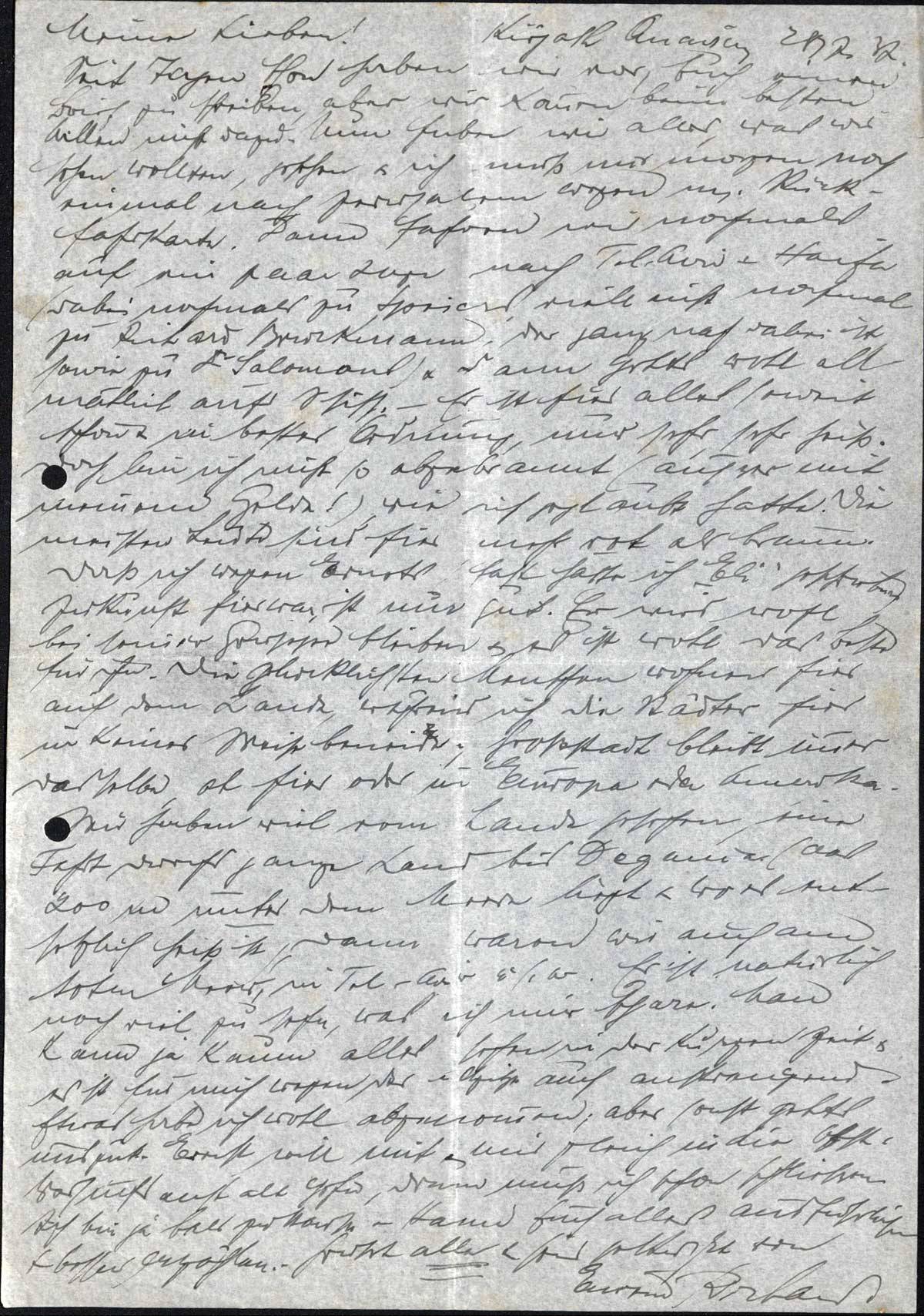 Wir haben viel vom Lande gesehen, eine Fahrt durchs ganze Land bis Degania (was 200 m unter dem Meere liegt & wo es entsetzlich heiß ist), dann waren wir auch am toten Meer, in Tel-Aviv u.s.w. Es ist natürlich noch viel zu sehn, was ich mir spare. Man kann ja kaum alles sehen in der kurzen Zeit & es ist für mich wegen der Hitze auch anstrengend. Etwas habe ich wohl abgenommen; aber sonst gehts uns gut. Ernst will mit mir gleich in die [..] Versuchsanstalt [..], darum muß ich schon schließen. Ich bin ja bald zuhause & kann Euch alles ausführlicher & besser erzählen. - Grüßt alle & seid geküßt von