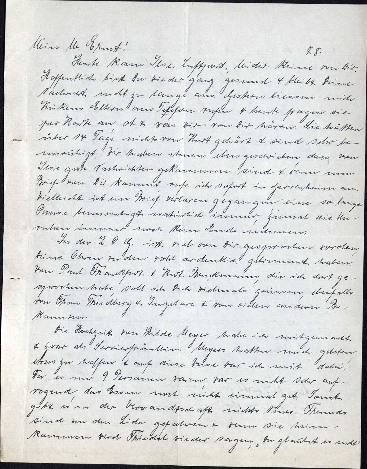 In der Z.O.G. ist viel von Dir gesprochen worden, Deine Ohren werden wohl ordentlich gebrummt haben. Von Paul Frankfurt & Kurt Bruckmann, die ich dort gesprochen habe, soll ich Dich vielmals grüssen, ebenfalls von Frau Friedberg & Ingelore & von vielen andern Bekannten.
