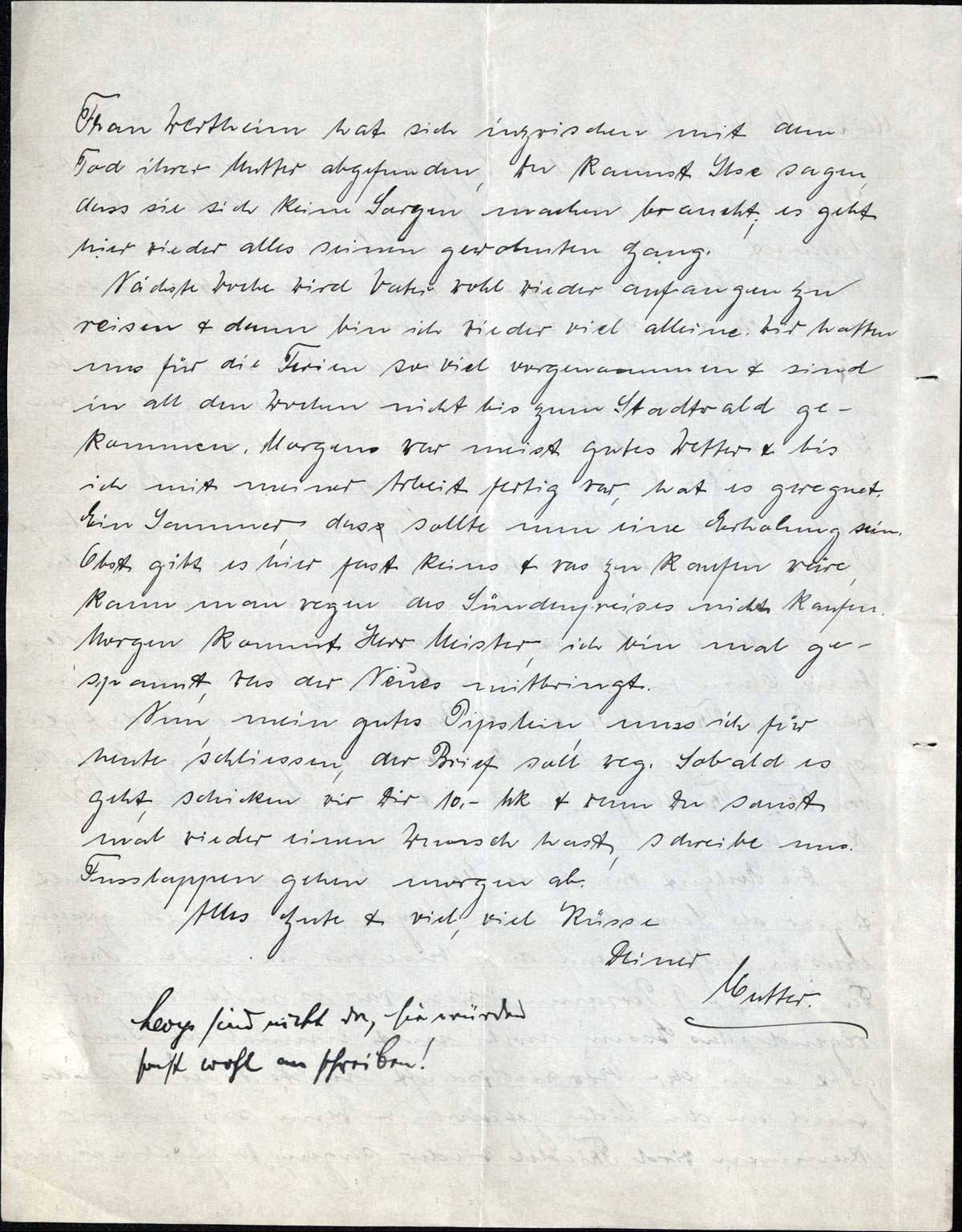 Nun, mein gutes Pipslein, muss ich für heute schliessen, der Brief soll weg. Sobald es geht, schicken wir Dir 10,- Mk & wenn Du sonst mal wieder einen Wunsch hast, schreibe uns. Fusslappen gehen morgen ab.