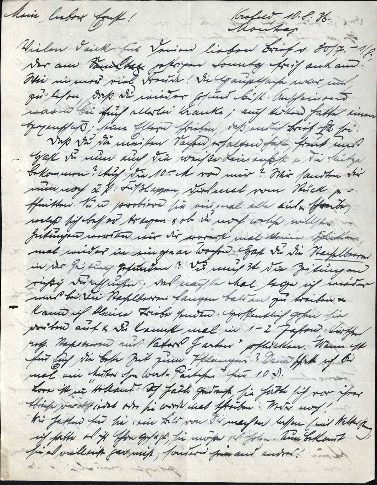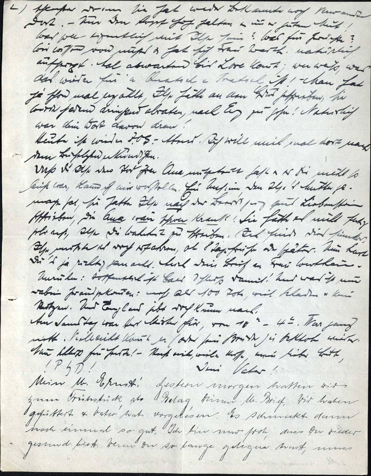 Mein lb. Ernst! Gestern morgen hatten wir zum Frühstück, als Belag, Deinen lb. Brief. Wir haben gefuttert & Vater hat vorgelesen. Es schmeckt dann noch einmal so gut. Ich bin nur froh, dass Du wieder gesund bist. Wenn Du so lange gelegen hast, muss