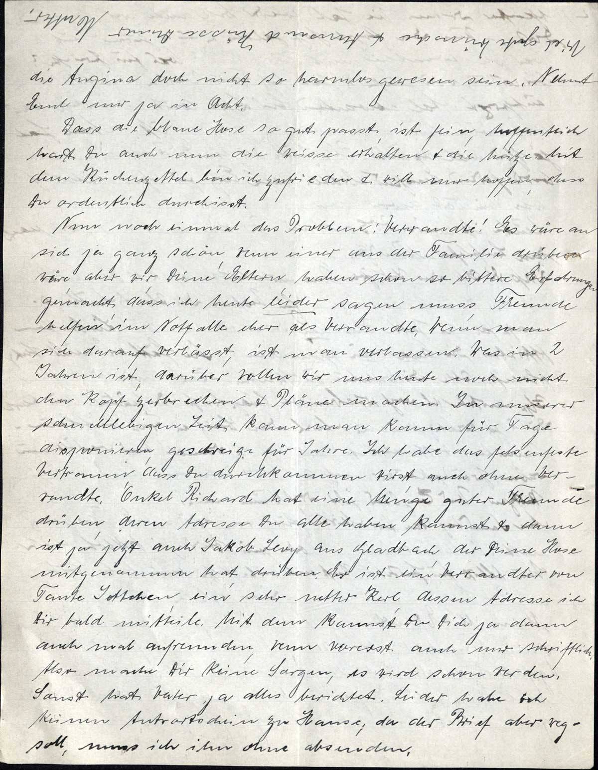Nun noch einmal das Problem: Verwandte! Es wäre an sich ja ganz schön, wenn einer aus der Familie drüben wäre, aber wir, Deine Eltern, haben schon so bittere Erfahrungen gemacht, dass ich heute leider sagen muss, Freunde helfen im Notfalle eher als Verwandte. Wenn man sich darauf verlässt, ist man verlassen. Was in 2 Jahre ist, darüber wollen wir uns heute noch nicht den Kopf zerbrechen & Pläne machen. In unserer schnelllebigen Zeit kann man kaum für Tage disponieren, geschweige für Jahre. Ich habe das felsenfeste Vertrauen, dass Du durchkommen wirst, auch ohne Verwandte. Onkel Richard hat eine Menge guter Freunde drüben, deren Adresse Du alle haben kannst & dann ist ja jetzt auch Jakob Levy aus Gladbach, der Deine Hose mitgenommen hat, drüben. Er ist ein Verwandter von Tante Jettchen, ein sehr netter Kerl, dessen Adresse ich Dir bald mitteile. Mit dem kannst Du Dich ja dann auch mal anfreunden, wenn vorerst auch nur schriftlich. Also mache Dir keine Sorgen, es wird schon werden. Sonst hat Vater ja alles berichtet. Leider habe ich keinen Antwortschein zu Hause; da der Brief aber weg soll, muss ich ihn ohne absenden.