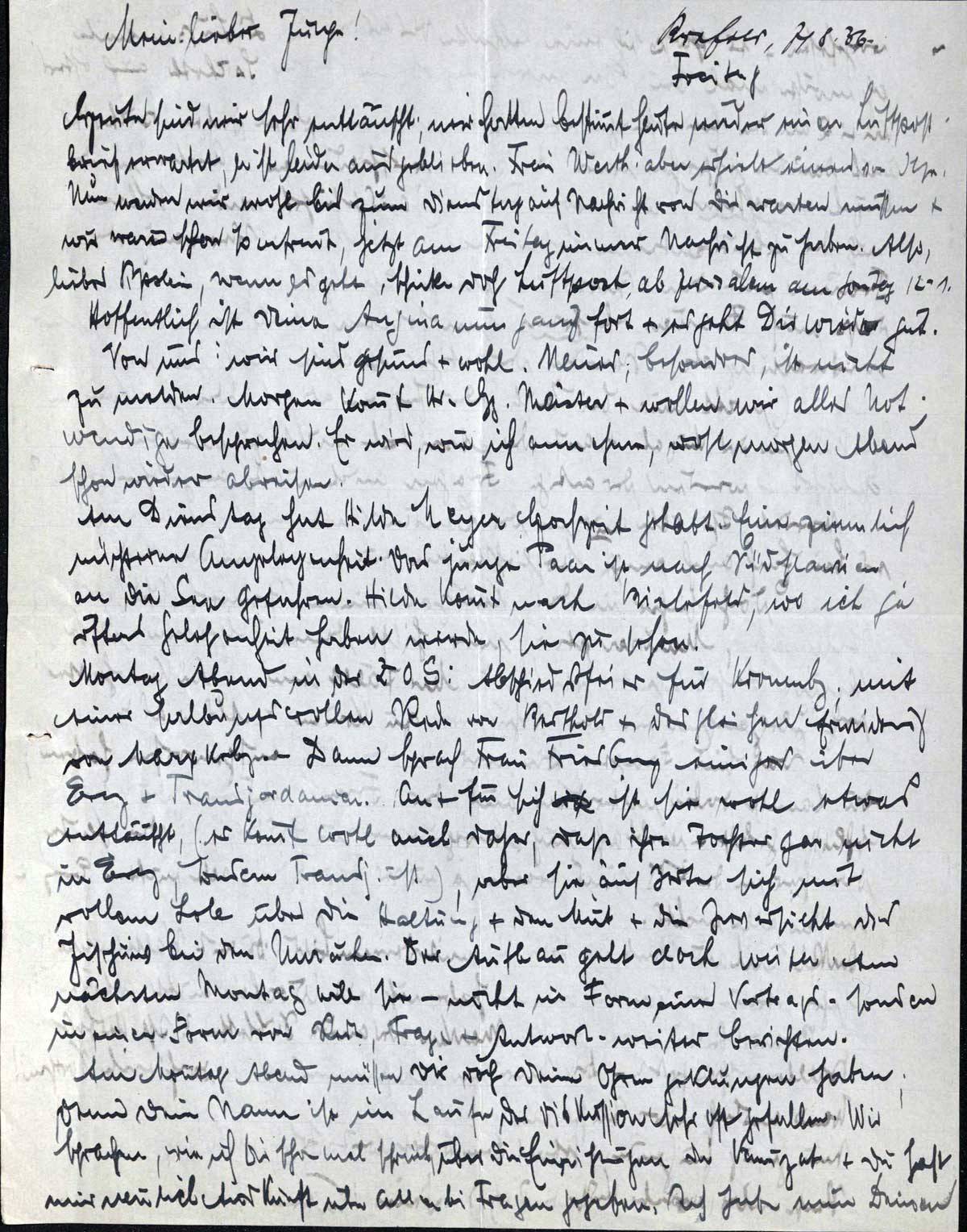 Montag Abend in der ZOG: Abschiedsfeier für Kronenbg; mit einer salbungsvollen Rede von Berthold & der gleichen Erwiderung von Marx Krbg. - Dann sprach Frau Friedberg einiges über Erez & Transjordanien. An & für sich ist sie wohl etwas enttäuscht, (es kommt wohl auch daher, daß ihre Tochter gar nicht in Erez, sondern Transj. ist), aber sie aus[..] sich mit vollem Lob über die Haltung & den Mut & die Zuverzicht der Jischuv bei den Unruhen. Der Aufbau geht doch weiter. Am nächsten Montag will sie - nicht in Form eines Vortrags - sondern in einer Form von Rede, Frage & Antwort - weiter berichten.