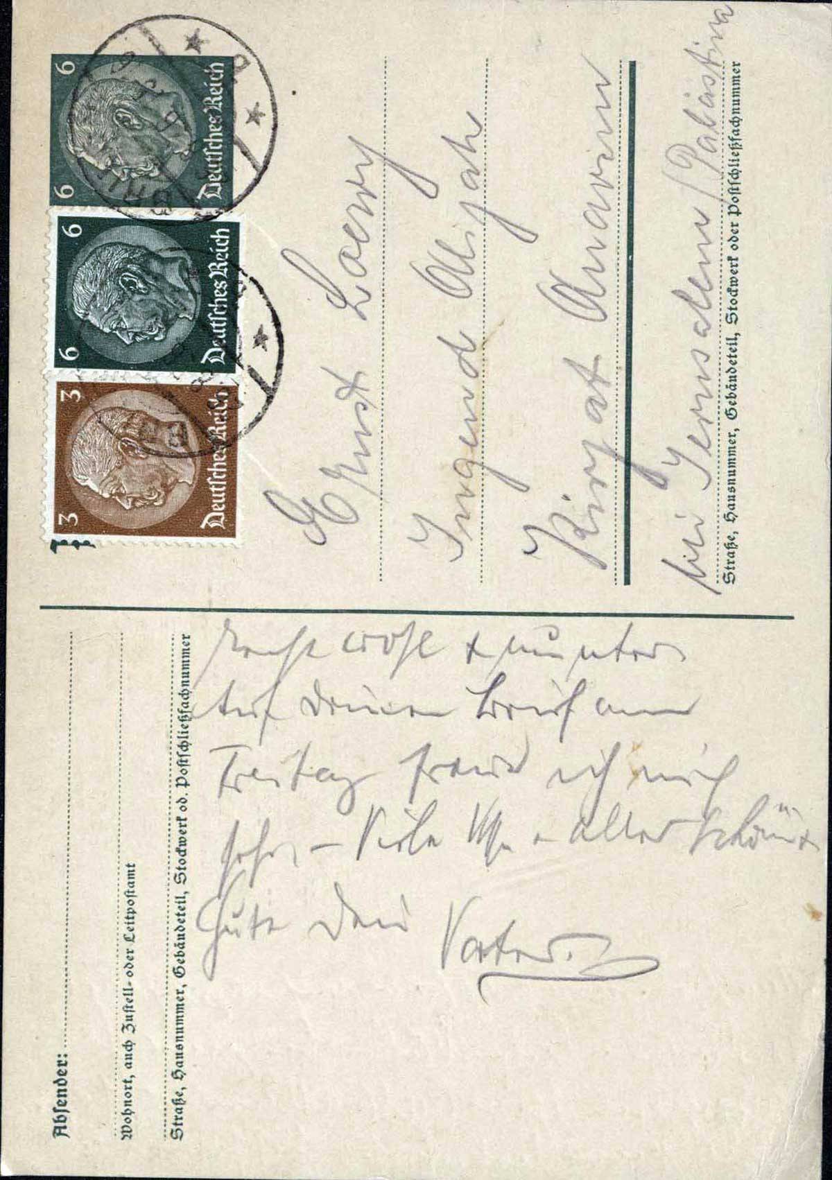 Mein lb. Ernst. Seit Montag bin ich mit Vater im Sauerland & ist die Gegend hier wirklich sehr schön. Heute ist das Wetter nur nicht besonders; kühl, wenig Sonne & das ist auf Reisen nicht so angenehm. Hoffentlich geht es Dir, mein Junge, recht gut. Gestern sprach ich auch in Meschede den Herrn, der in Kirjat A. war & hat er mir noch einmal alles ausführlich geschildert. Es hat ihm sehr gut gefallen. Wenn wir Freitag nach Hause kommen, hoffen wir wieder Post von Dir zu haben. Inzwischen nimm viel Grüsse aus Brilon & herzliche Küsse & viele gute Wünsche Deiner Mutter.