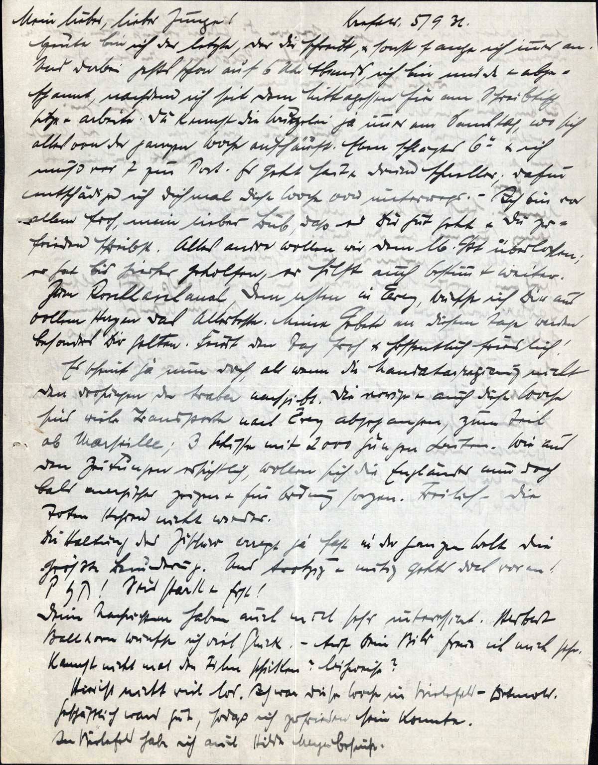 Heute bin ich der letzte, der Dir schreibt, & sonst fange ich immer an. Und dabei gehts schon auf 6 Uhr Abends, ich bin müde & abgespannt, nachdem ich seit dem Mittagessen hier am Schreibtisch sitze & arbeite. Du kennst die Kritzelei ja immer am Samstag, wo sich alles von der ganzen Woche aufhäuft. Eben schlugs 6 h & ich muß vor 7 zur Post. Es geht heute darum schneller; dafür entschädige ich Dich mal diese Woche von unterwegs. - Ich bin vor allem froh, mein lieber Bub, daß es Dir gut geht & Du zufrieden schreibst. Alles andre wollen wir dem lb. Gtt überlassen; er hat bis hierher geholfen, er hilft auch bestimmt weiter.
