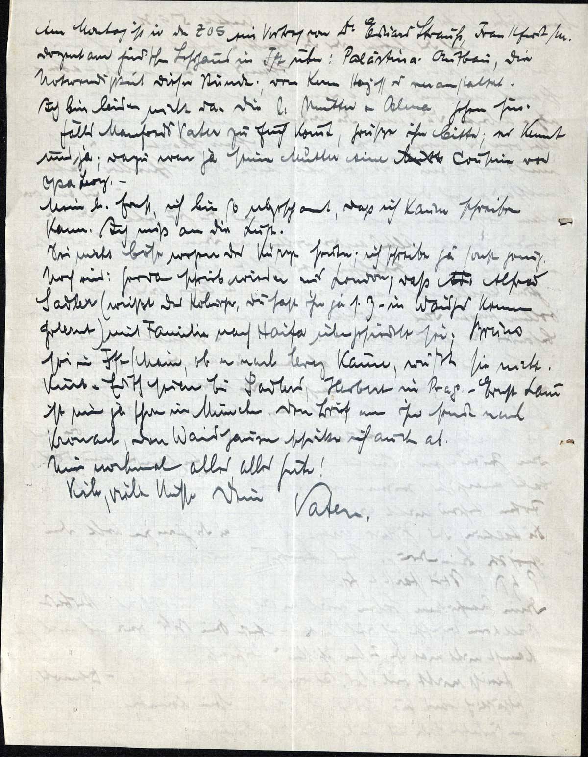Am Montag ist in der ZOG ein Vortrag von Dr. Eduard Strauß, Frankfurt/M. Dozent am jüdischen Lehrhaus in Fft. über: Palästina - Aufbau, die Notwendigkeit dieser Stunde; von [..] veranstaltet. Ich bin leider nicht da. Die l. Mutter & Alma gehen hin.