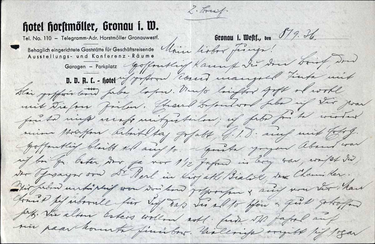 Hoffentlich kannst Du den Brief, den ich gestern Abend mangels Tinte mit Blei geschrieben habe, lesen. Umso leichter geht es wohl mit diesen Zeilen. Etwas Besondres habe ich Dir zwar heute nicht mehr mitzuteilen; ich habe heute wieder einen straffen Arbeitstag gehabt, G. s. D. auch mit Erfolg. Hoffentlich bleibt es auch so. Heute gegen Abend war ich bei Hn. Oster, der ja vor 1 ½ Jahren in Erez war, weißt Du, der Schwager von Dr. Berl in Kirjath Bialik, der Chemiker. Wir haben natürlich von drüben gesprochen & auch von Dir. Man freut sich überall für Dich, daß Du es so schön & gut getroffen hast. Die alten Osters wollen evtl. Ende dieses Jahres auf ein paar Monate hinüber. Vielleicht ergibt sich sogar