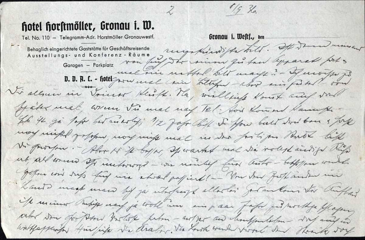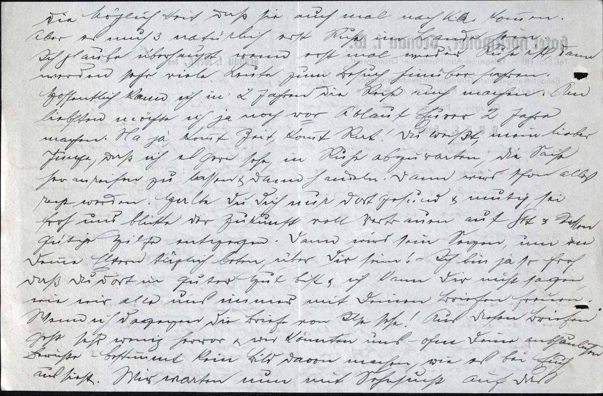 die Möglichkeit, daß sie auch mal nach K. A. kommen. Aber es muß natürlich erst Ruhe im Lande sein. Ich glaube überhaupt, wenn erst mal wieder Ruhe ist, dann werden sehr viele Leute zum Besuch hinüber fahren. Hoffentlich kann ich in 2 Jahren die Reise auch machen. Am liebsten möchte ich ja noch vor Ablauf Eurer 2 Jahre machen. Na ja, kommt Zeit, kommt Rat! Du weißt, mein lieber Junge, daß ich es gern sehe, in Ruhe abzuwarten, die Sache heranreifen zu lassen & dann handeln. Dann wird schon alles recht werden. Halte Du Dich nur dort gesund & mutig, sei froh und blicke der Zukunft voll Vertrauen auf Gtt & dessen geistiger Hilfe entgegen. Dann wird sein Segen, um den Deine Eltern täglich beten, über Dir sein! - Ich bin ja so froh, daß Du dort in guter Hut bist & ich kann Dir nicht sagen, wie wir alle uns immer mit Deinen Briefen freuen. Wenn ich dagegen die Briefe von Ilse sehe! Aus diesen Briefen geht sehr wenig hervor & wir könnten uns ohne Deine anschaulichen Berichte bestimmt kein Bild davon machen, wie es bei Euch aussieht. Wir warten nun mit Sehnsucht auf das