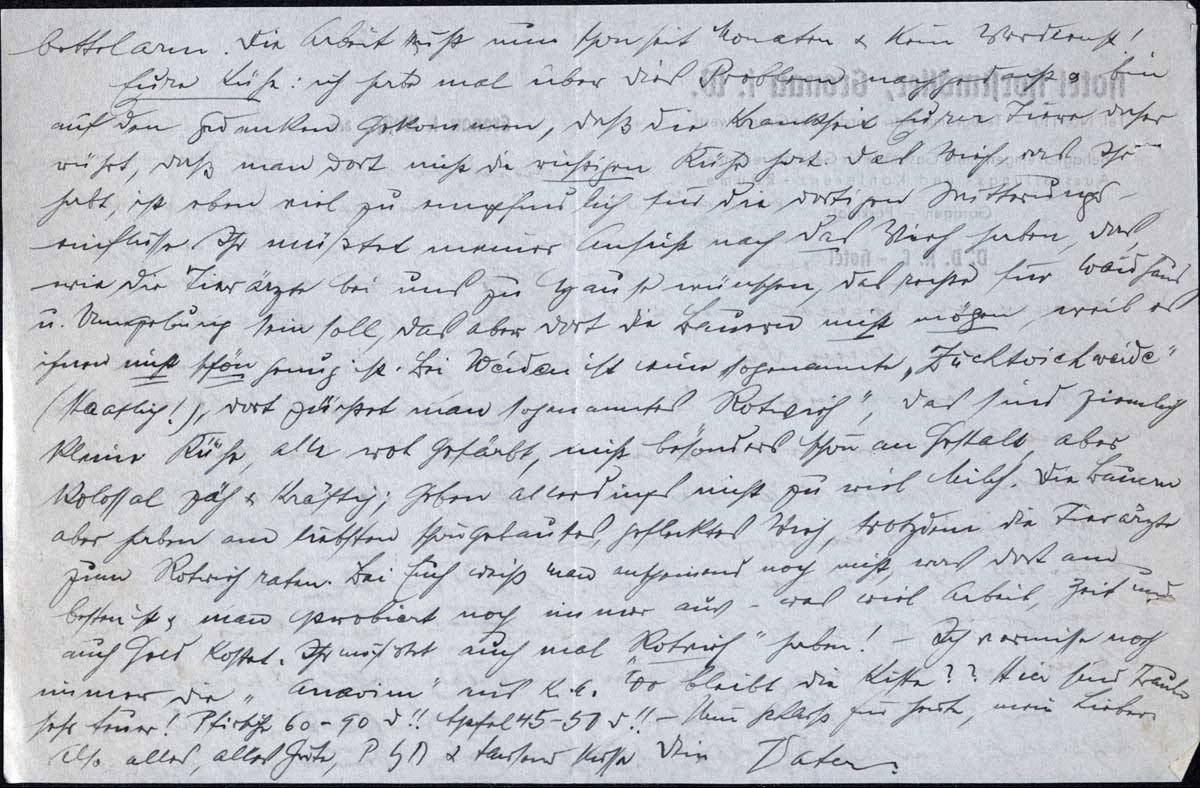 Eure Kühe: ich habe mal über dies Problem nachgedacht & bin auf den Gedanken gekommen, daß die Krankheit Eurer Tiere daher rührt, daß man dort nicht die richtigen Kühe hat. Das Vieh, das Ihr habt, ist eben viel zu empfindlich für die dortigen Witterungseinflüsse. Ihr müßtet meiner Ansicht nach das Vieh haben, das, wie die Tierärzte bei uns zu Hause wünschen, das recht für Waidhaus u. Umgebung sein soll, das aber dort die Bauern nicht mögen, weil es ihnen nicht schön genug ist. Bei Weiden ist eine sogenannte „Zuchtviehweide” (staatlich!), dort züchtet man sogenanntes „Rotvieh”, das sind ziemlich kleine Kühe, alle rot gefärbt, nicht besonders schön an Gestalt, aber kolossal zäh & kräftig; geben allerdings nicht zu viel Milch. Die Bauern aber haben am liebsten schön gebautes, geflecktes Vieh, trotzdem die Tierärzte zum Rotvieh raten. Bei Euch weiß man anscheinend noch nicht, was dort am besten ist & man probiert noch immer aus - was viel Arbeit, Zeit und auch Geld kostet. Ihr müßtet auch mal „Rotvieh” haben! - Ich vermisse noch immer die „Anavim” aus K. A. Wo bleibt die Kiste?? Hier sind Trauben sehr teuer! Pfirsiche 60-90 Pf.!! Äpfel 45-50 Pf.!! - Nun Schluß für heute, mein Lieber.