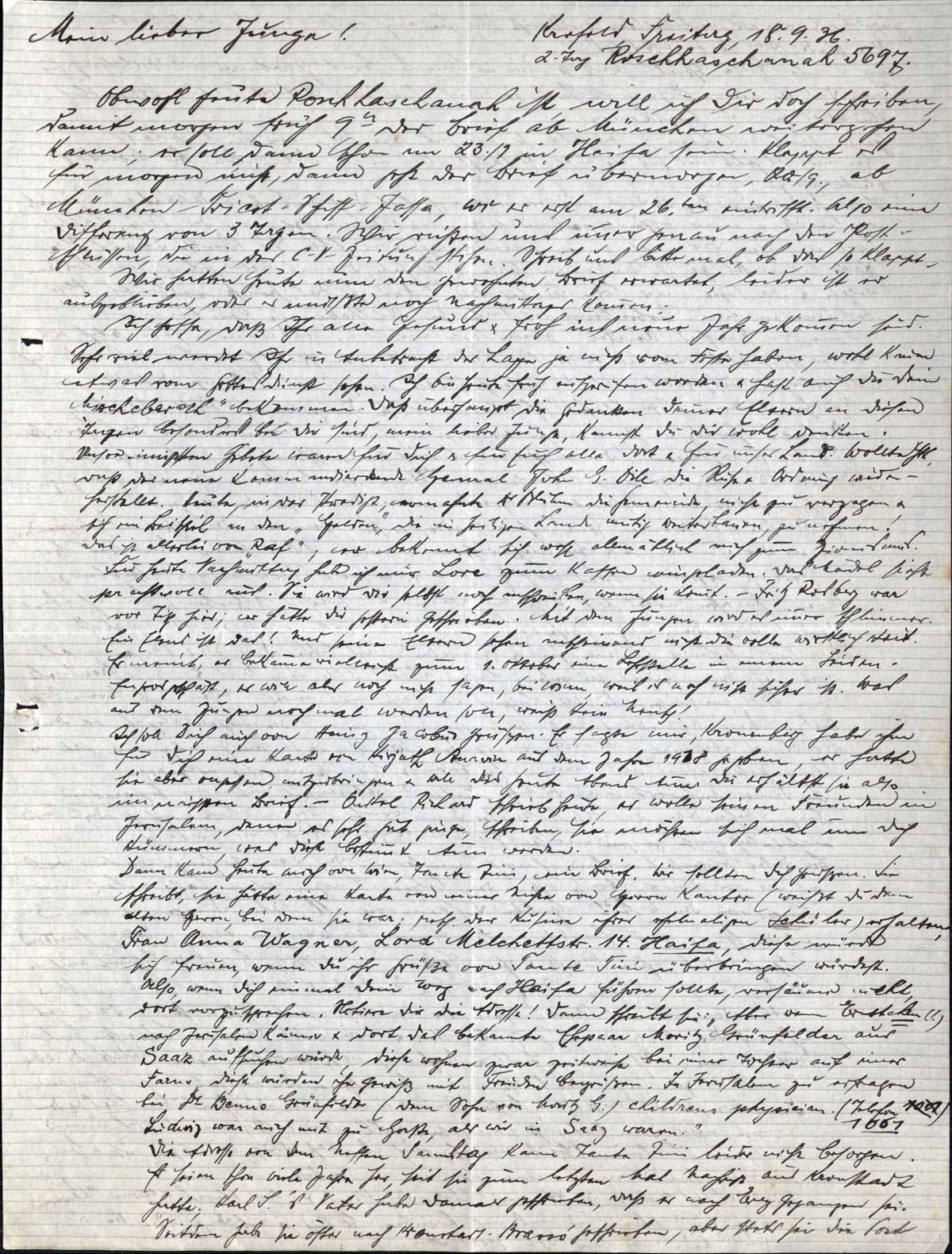 Obwohl heute Rosch haschanah ist, will ich Dir doch schreiben, damit morgen früh 9 h der Brief ab München weitergehen kann; er soll dann schon am 23./9. in Haifa sein. Klappt es für morgen nicht, dann geht der Brief übermorgen, 20/9., ab München-Triest-Schiff-Jaffa, wo er erst am 26.ten eintrifft. Also eine Differenz von 3 Tagen. Wir richten uns immer genau nach den Postschiffen, die in der C.V. Zeitung stehn. Schreib uns bitte mal, ob das so klappt.