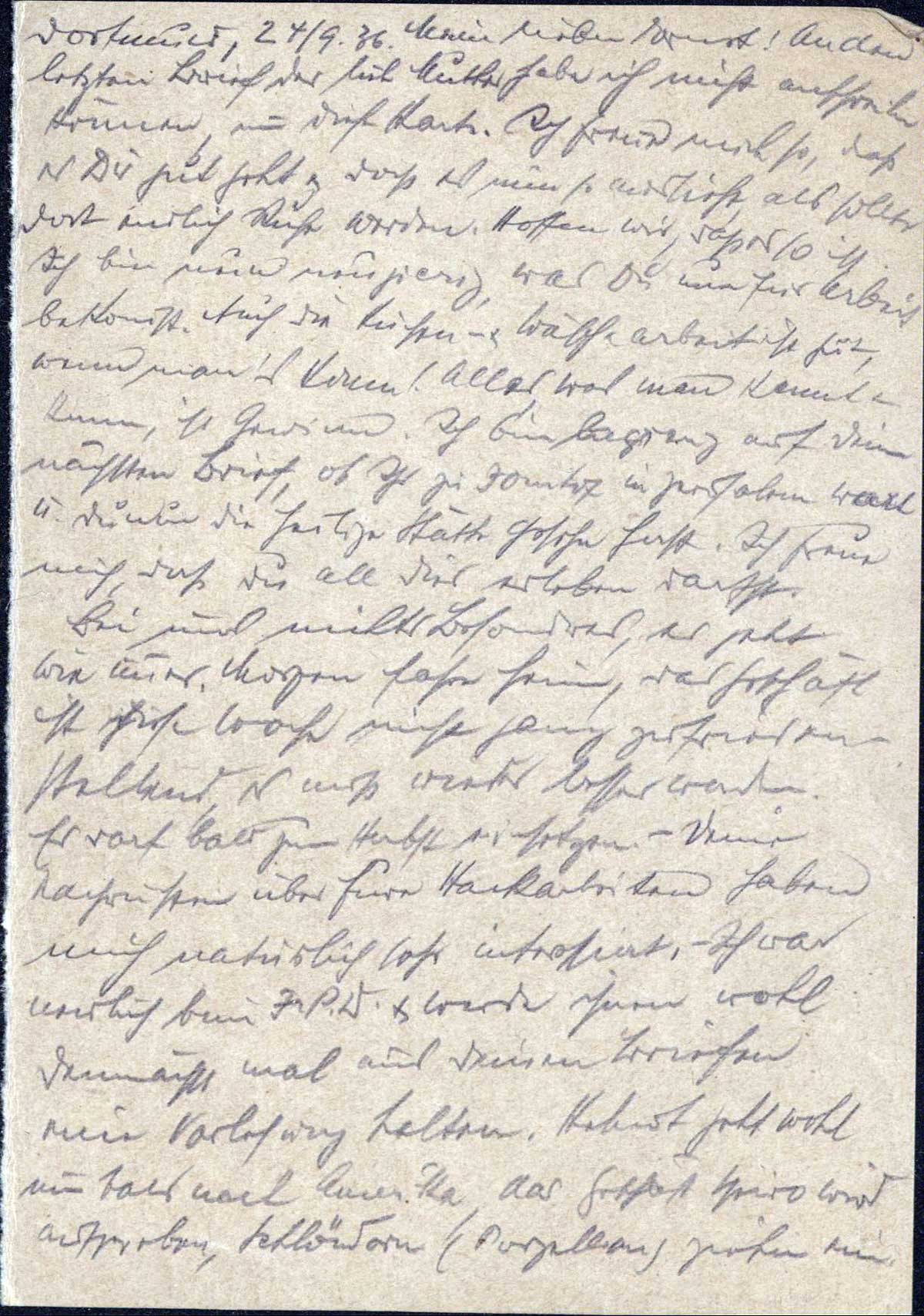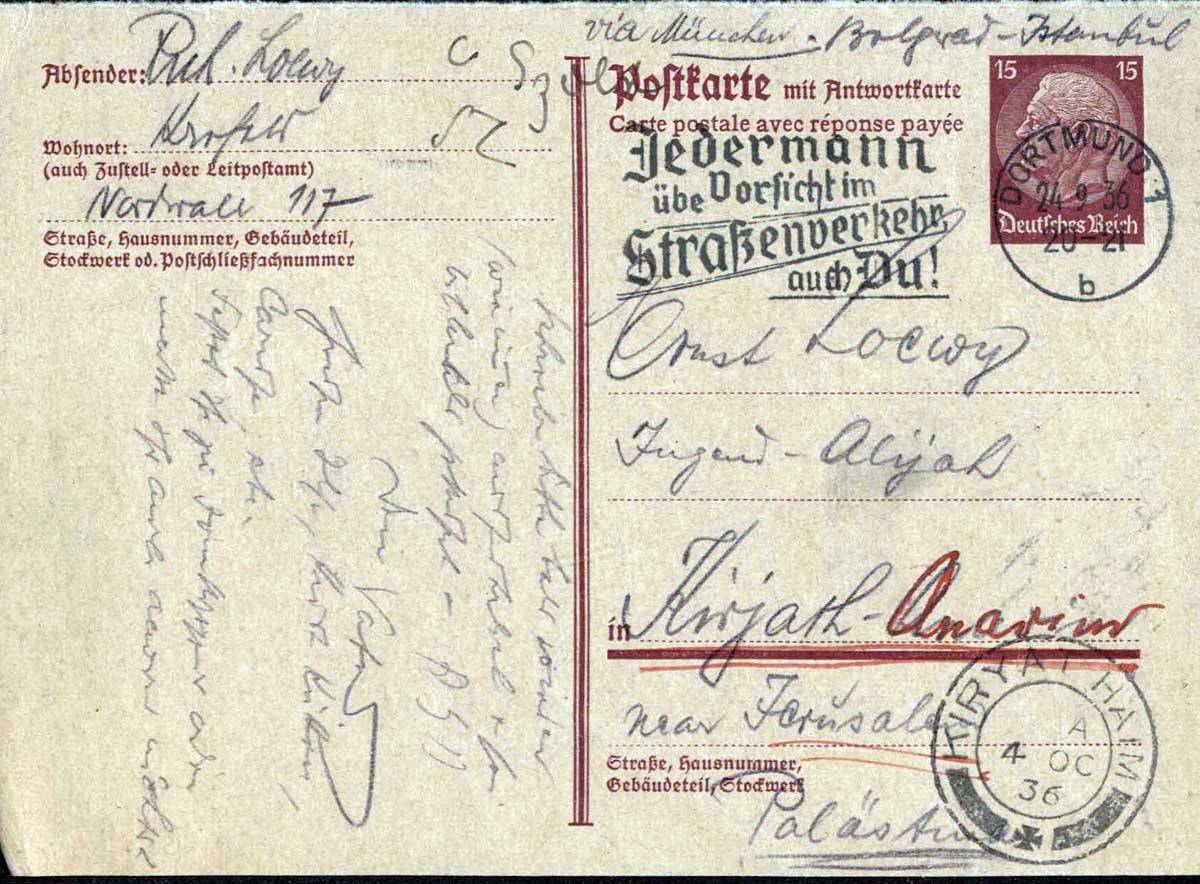 Dortmund, 24/9.36. Mein lieber Ernst! An den letzten Brief der lieben Mutter habe ich nicht anschreiben können, nun diese Karte. Ich freue mich so, daß es Dir gut geht & daß es nun so aussieht, als sollte dort endlich Ruhe werden. Hoffen wir, daß es so ist. Ich bin nun neugierig, was Du nun für Arbeit bekommst. Auch die Küchen- & Wäschearbeit ist gut, wenn man's kann! Alles, was man kennt & kann, ist Gewinn. Ich bin begierig auf Deinen nächsten Brief, ob Ihr zu Jontef in Jerusalem wart u. Du nun die heilige Stätte gesehen hast. Ich freue mich, daß Du alle das erleben darfst.