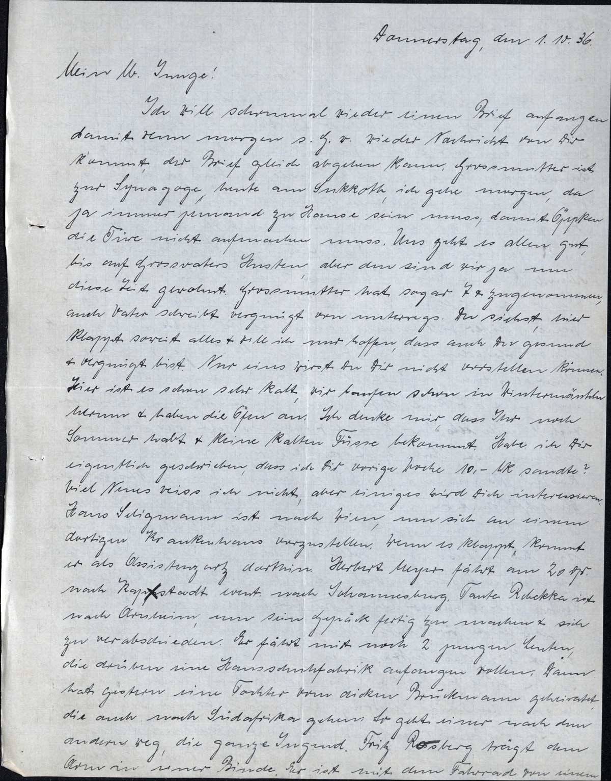 Ich will schonmal wieder einen Brief anfangen, damit wenn morgen s. G. w. wieder Nachricht von Dir kommt, der Brief gleich abgehen kann. Grossmutter ist zur Synagoge, heute am Sukkoth, ich gehe morgen, da ja immer jemand zu Hause sein muss, damit Öppken die Tür nicht aufmachen muss. Uns geht es allen gut, bis auf Grossvaters Husten, aber den sind wir ja um diese Zeit gewohnt. Grossmutter hat sogar 7 Pfd. zugenommen, auch Vater schreibt vergnügt von unterwegs. Du siehst, hier klappt soweit alles & will ich nur hoffen, dass auch Du gesund & vergnügt bist. Nur eins wirst Du Dir nicht vorstellen können. Hier ist es schon sehr kalt, wir laufen schon in Wintermänteln herum & haben die Öfen an. Ich denke mir, dass Ihr noch Sommer habt & keine kalten Füsse bekommt. Habe ich Dir eigentlich geschrieben, dass ich Dir vorige Woche 10,- Mk sandte? Viel Neues weiss ich nicht, aber einiges wird Dich interessieren. Hans Seligmann ist nach Wien, um sich an einem dortigen Krankenhaus vorzustellen. Wenn es klappt, kommt er als Assistenzarzt dorthin. Herbert Meyer fährt am 20 ds. nach Kapstadt event. nach Johannesburg. Tante Rebekka ist nach Arnheim, um sein Gepäck fertig zu machen & sich zu verabschieden. Er fährt mit noch 2 jungen Leuten, die drüben eine Hausschuhfabrik anfangen wollen. Dann hat gestern eine Tochter vom dicken Brückmann geheiratet, die auch nach Südafrika gehen. So geht einer nach dem andern weg, die ganze Jugend. Fritz Rosberg trägt den Arm in einer Binde. Er ist mit dem Fahrrad von einem